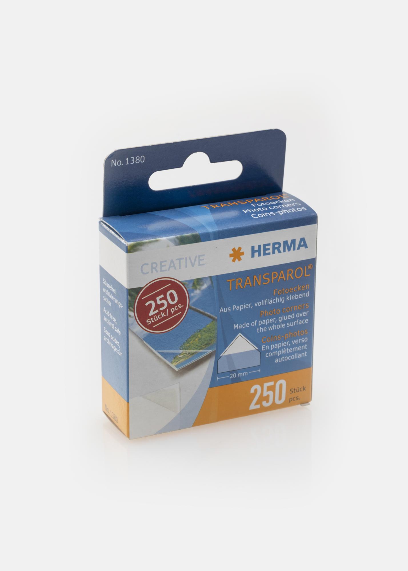 Self-adhesive transparent photo corners from Herma. Each package contains 250 photo corners. Used among other things for mounting pictures in photo albums. Each photo corner has a width of 20 mm.