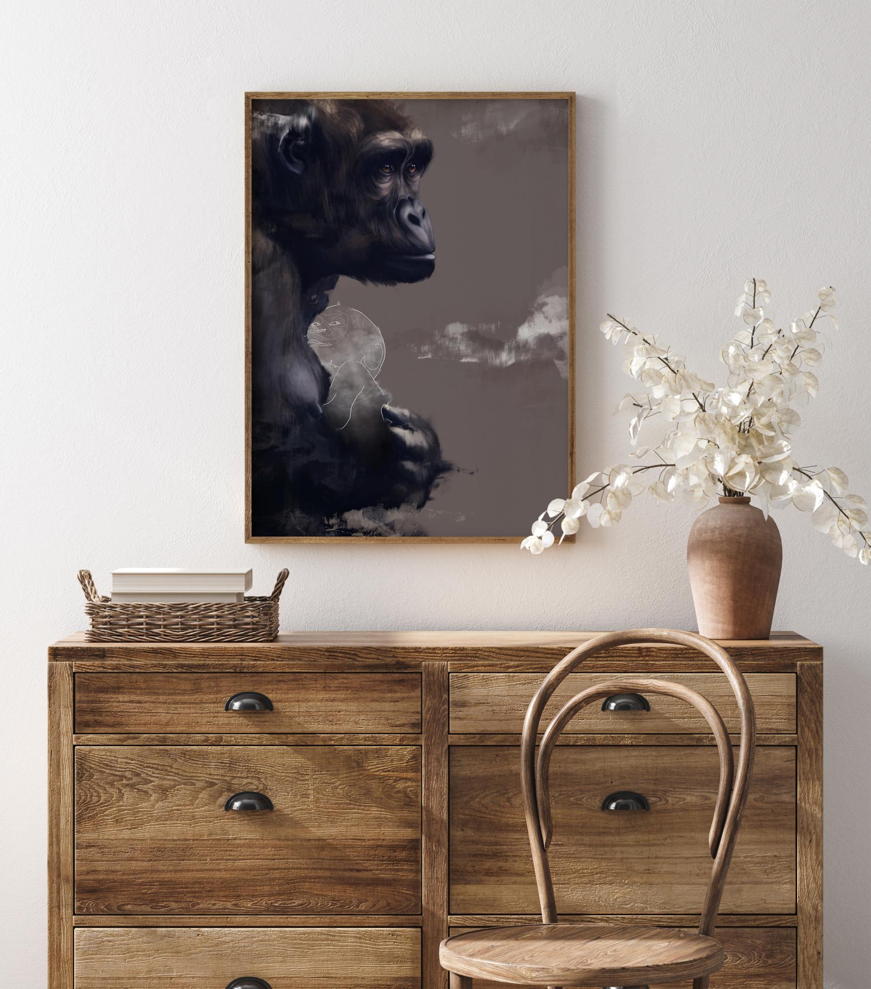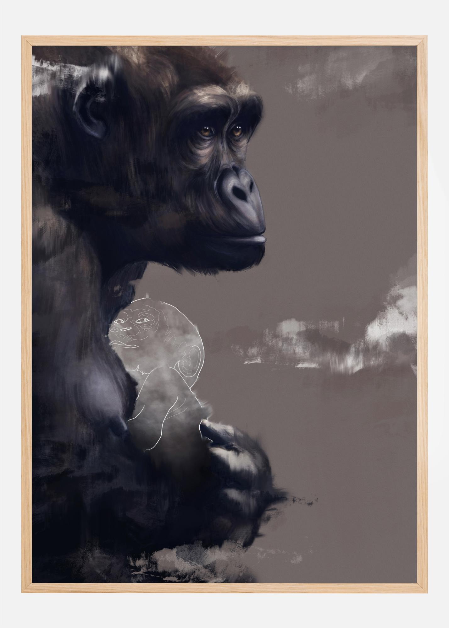 A striking nature print of a gorilla holding her newborn infant. Set on a light-brown background, this stocky mammal portrays a powerful yet gentle maternal instinct. Protecting the newborn infant in her loving arms, this incompleted print of a gorilla is the ideal print for any animal lover.
