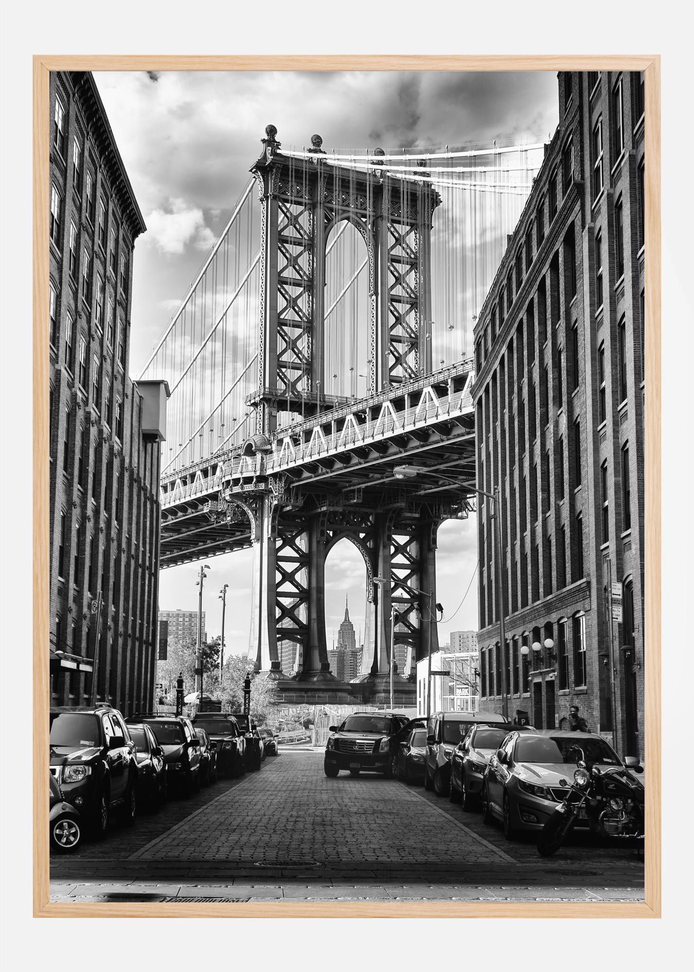 A black and white architectural poster of Manhattan Bridge. Under a cloudy sky, rows of cars are parked on either side of the street. In the distance, the magnificent Empire State Building stands tall. A perfect print to be hung in a super-modern environment.