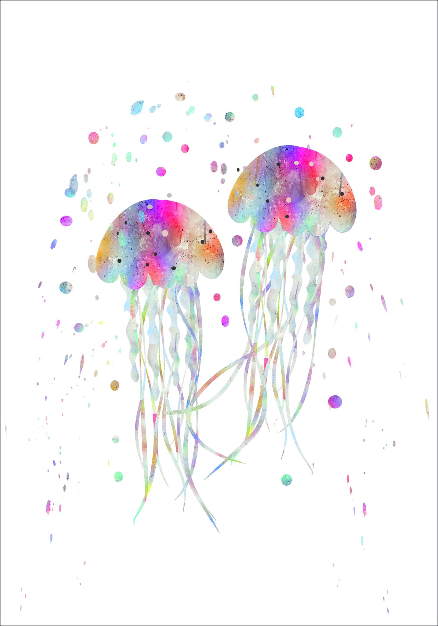 A fun and creative print of two small multicoloured jellyfish. With their colourful bells and tentacles, they are surrounded by colourful dots splashed randomly on a white background. A delightful portrait that will brighten up any room in your home.
