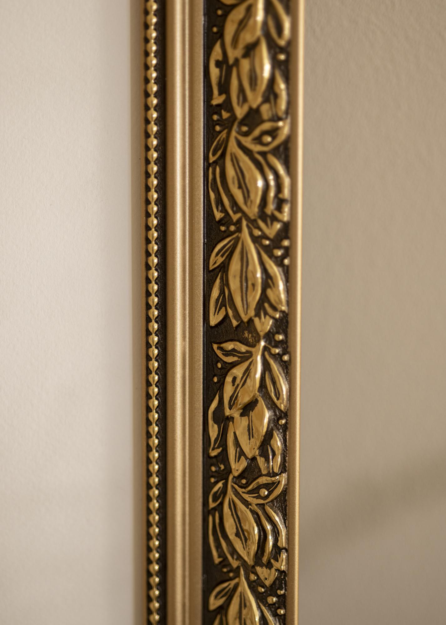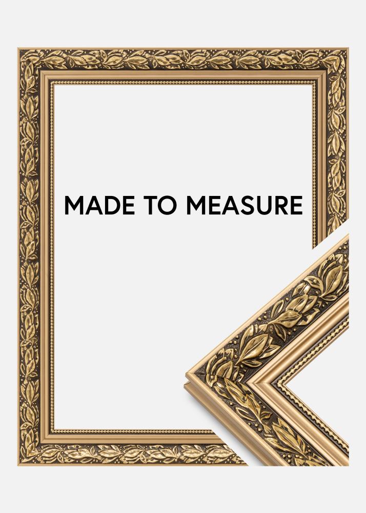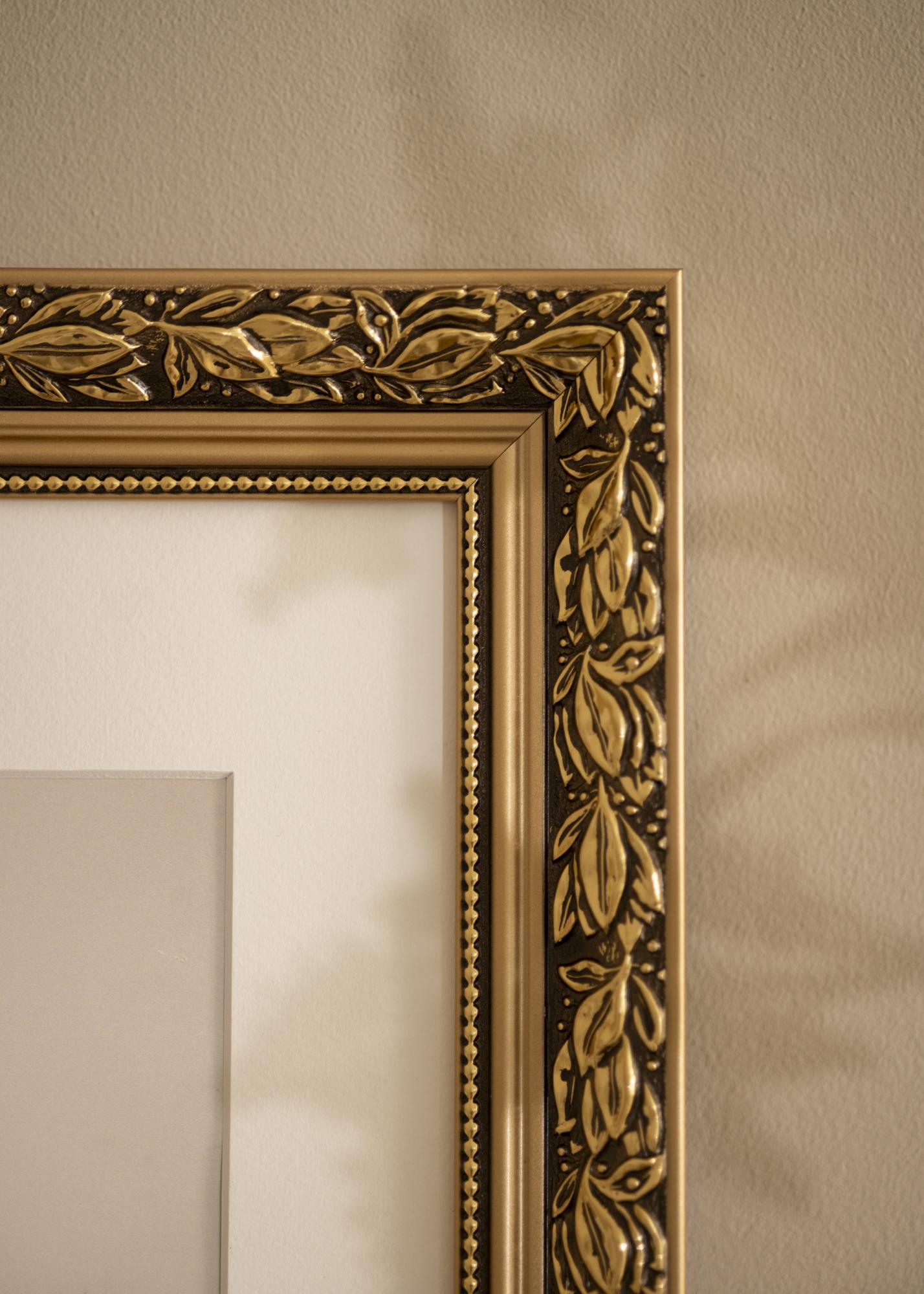 A valuable image deserves a beautiful picture frame! Here we have a romantically designed photo frame with gold-coloured edges, winding leaf patterns in gold against a brown background and a sweet gold ribbon, with pearl shapes closest to the glass. Use it to display an old black and white photograph that you have inherited, or create an exciting contrast with a picture you've taken recently. As the frame is made to measure, you can be sure that it fits exactly where you want to place it!