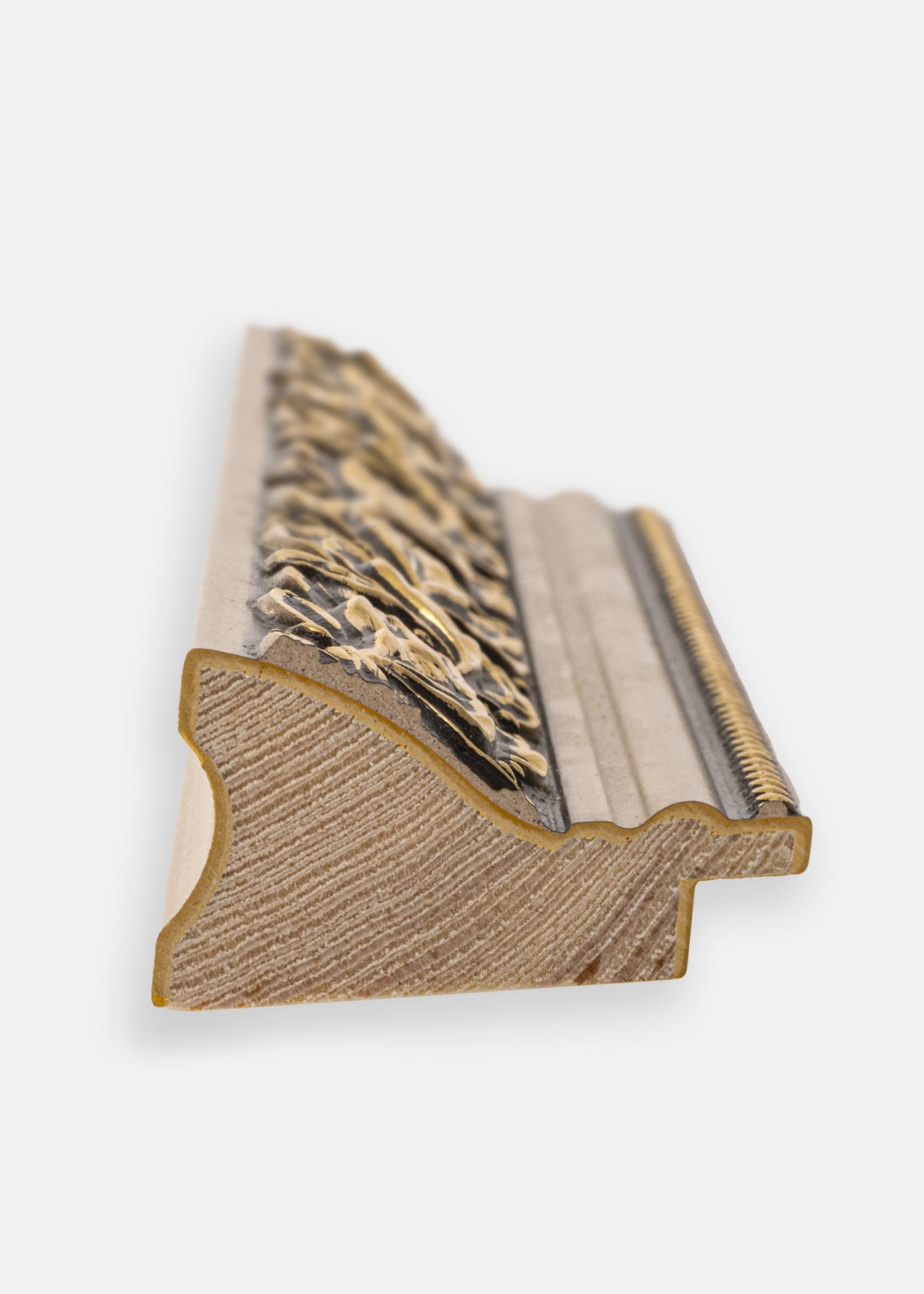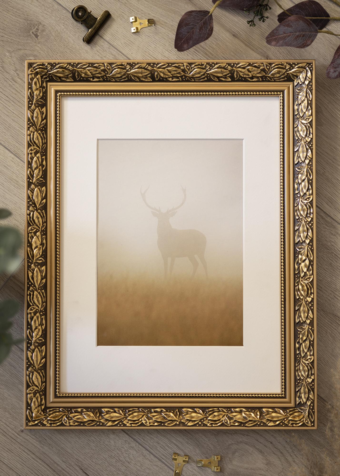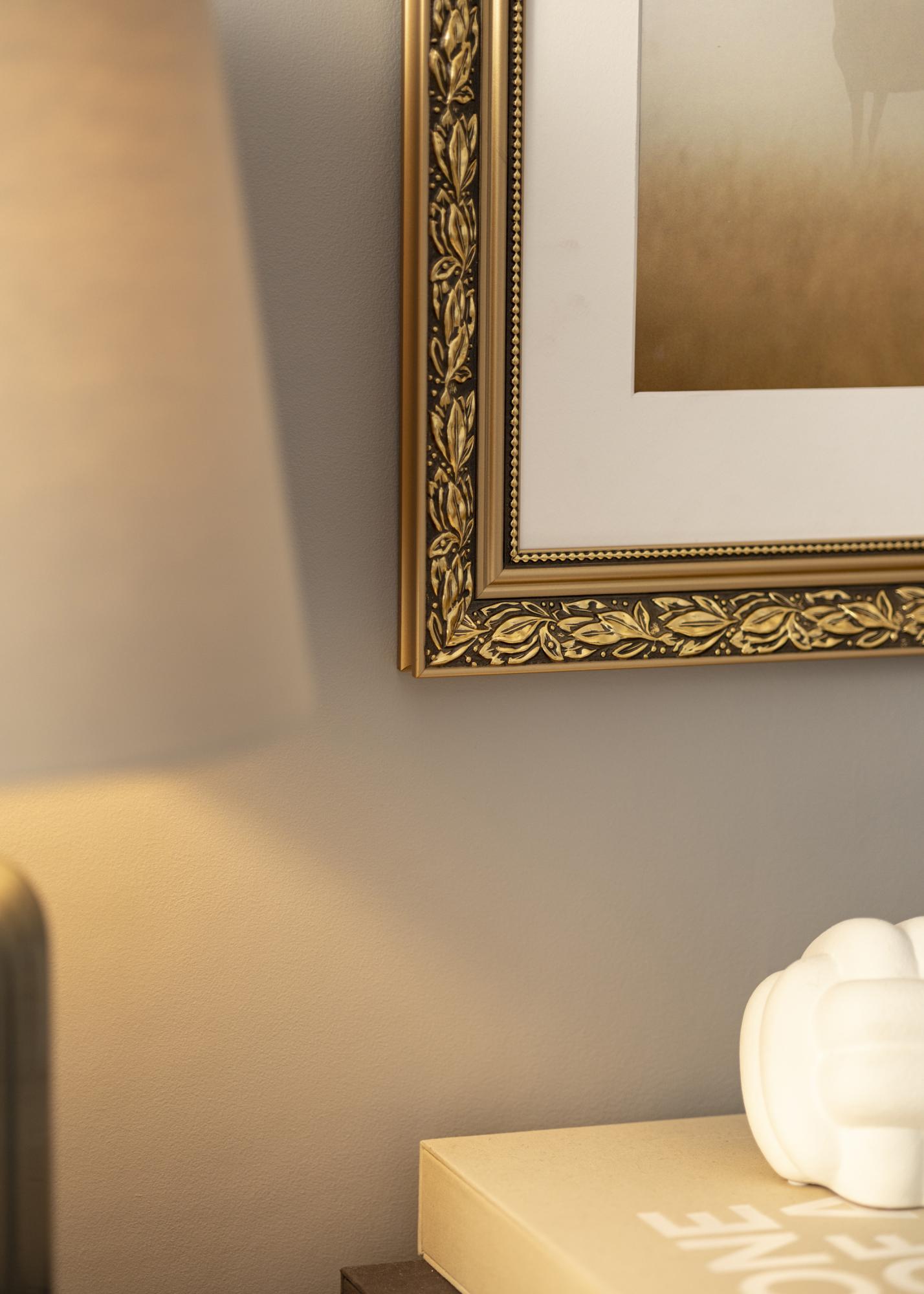 A valuable image deserves a beautiful picture frame! Here we have a romantically designed photo frame with gold-coloured edges, winding leaf patterns in gold against a brown background and a sweet gold ribbon, with pearl shapes closest to the glass. Use it to display an old black and white photograph that you have inherited, or create an exciting contrast with a picture you've taken recently. As the frame is made to measure, you can be sure that it fits exactly where you want to place it!