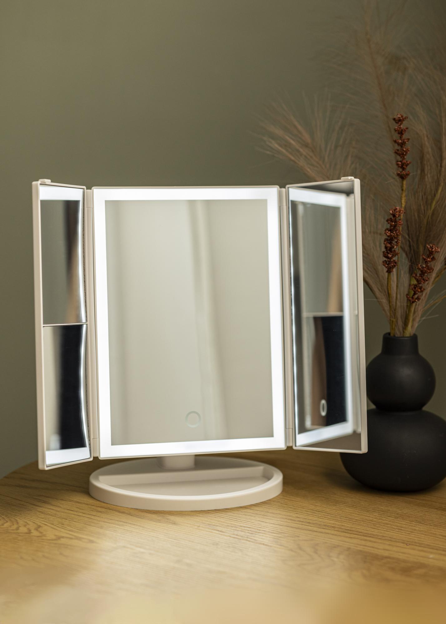 A fashionable and attractive makeup mirror with stand, four different mirror surfaces and dimmable LED lighting. The mirror’s left side has magnifying mirror glass with x2 and x3 zoom. The integrated LED lighting makes an attractive frame for the large mirror in the middle, and has a pleasant, warm 3000K white light. You can light it by by simply touching the button on the screen, and then adjusting it by holding the button for a few seconds. The mirror measures 38x30 cm, and the angle of it can be adjusted, allowing you to see your reflection from several different angles.