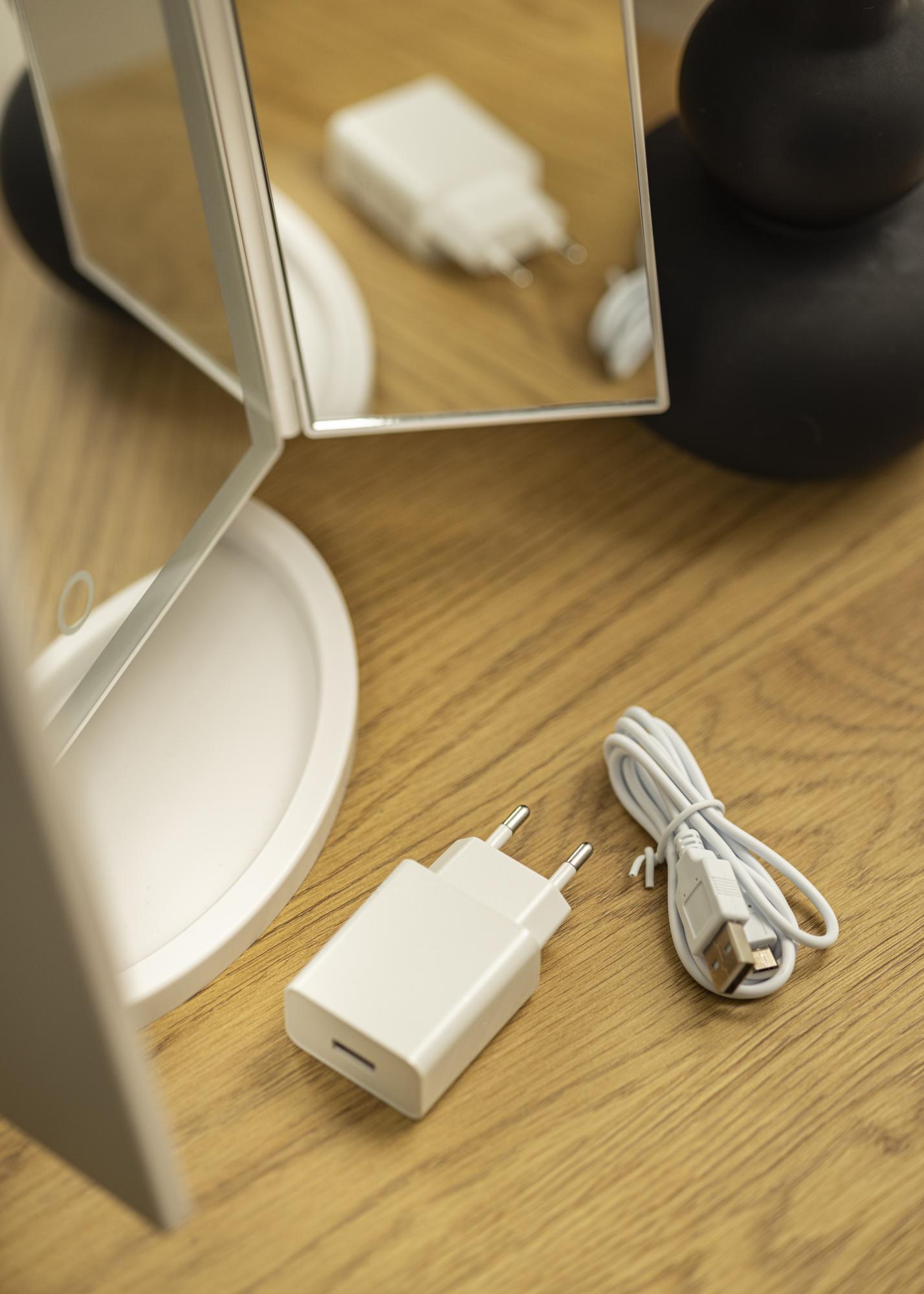 The mirror is powered by x4 AA batteries (not included), but can alternatively be charged with the included USB cable and plug.