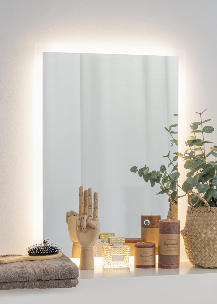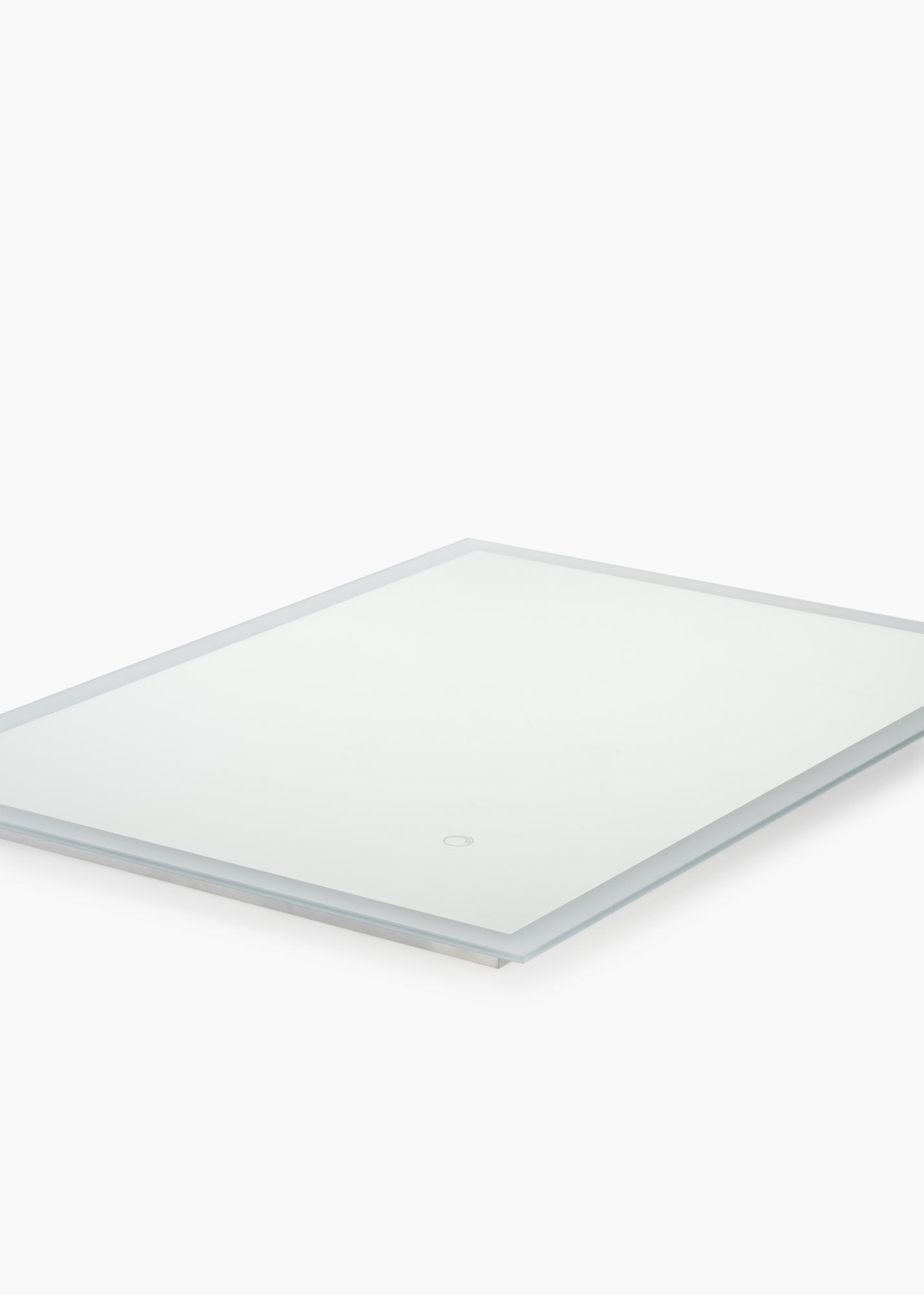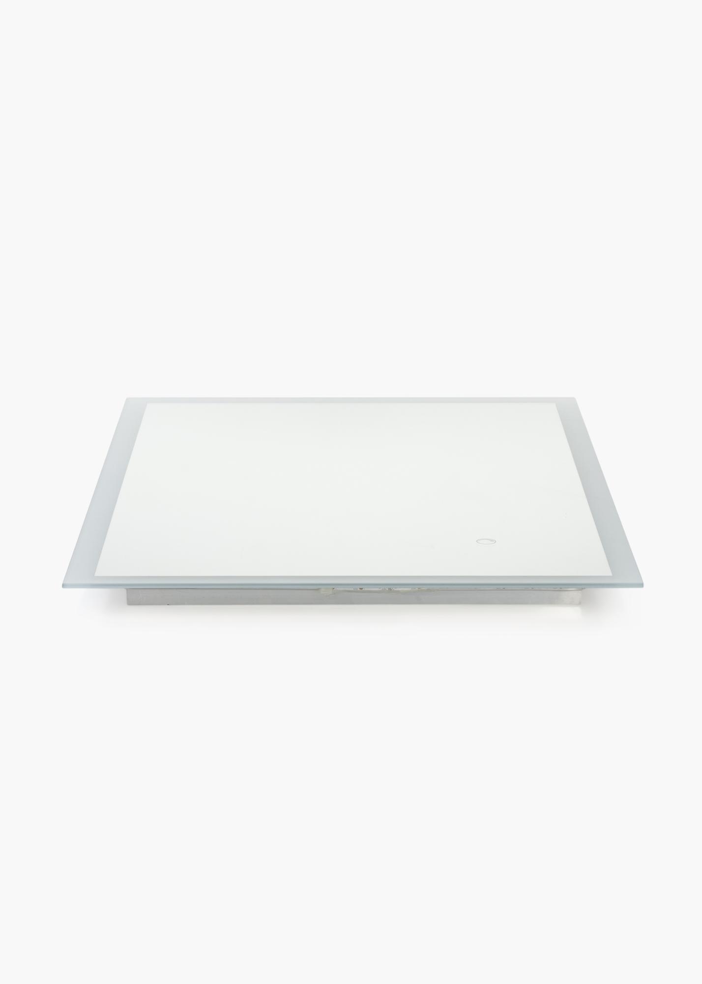 This attractive, Swedish design mirror from KAILA has a rectangular shape with frosted edges. Behind the stylish edges, the mirror has integrated LED lighting, which lights up the mirror with a pleasant, warm and white 3000K light. The LED lighting is adjustable, and you can easily adapt the strength of the light to your preferences by holding down the watertight touch button on the screen for a couple of seconds. The mirror automatically remembers your most recent light setting for the next time you turn it on. LED is an energy efficient light source which gives an even and natural light.