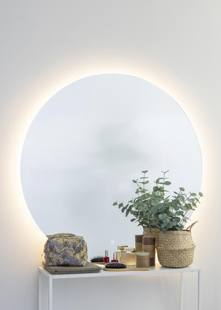 This is an elegant, classic round bathroom mirror with Swedish design from KAILA. The mirror has integrated, dimmable LED lighting which lights up from behind and creates a beautiful, warm 3000K glow at the front. The lighting is dimmable, and you can simply adjust the strength by holding the button for a few seconds. LED lighting is an energy-effective and gives an even and natural light.