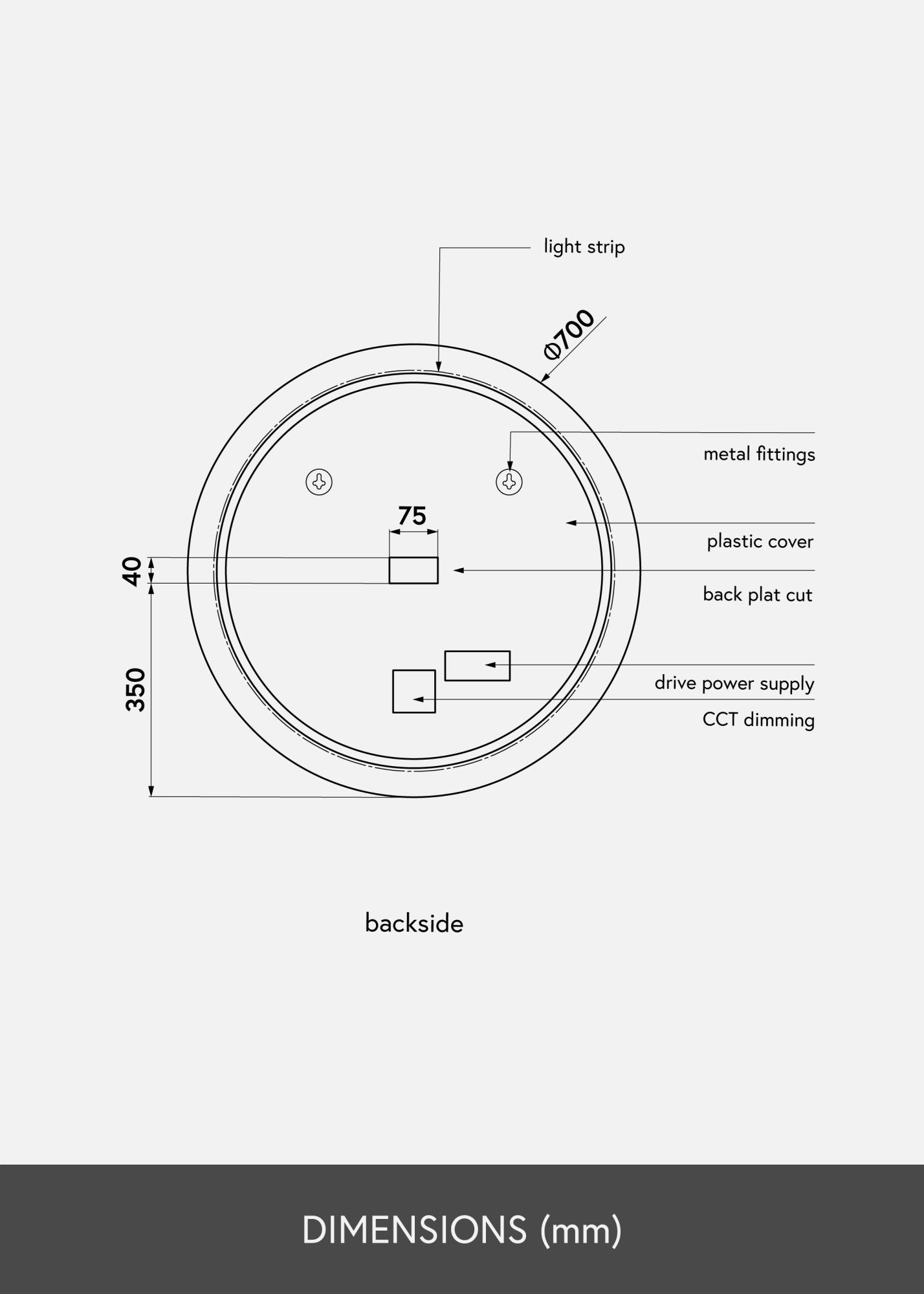 The mirror is approved for bathroom use, but its timeless and elegant design looks great on any of the home’s other walls! The mirror has a 70 cm diameter, is just 3 cm deep, and comes with wall fixings. This mirror is intended for fixed installation and for connecting to a light switch. For the mirror to function correctly, it must be connected to a standard switch, not a dimmer switch.