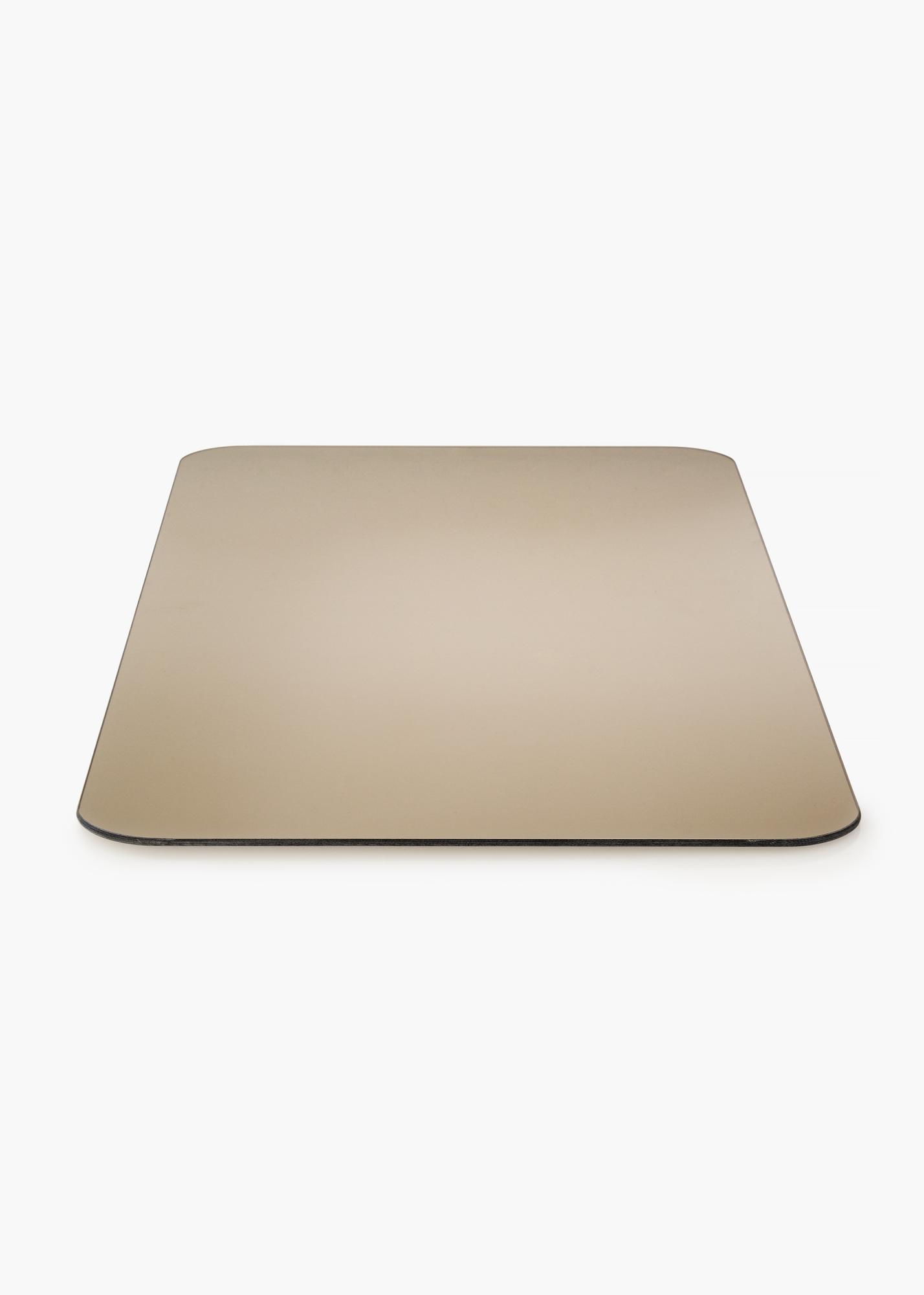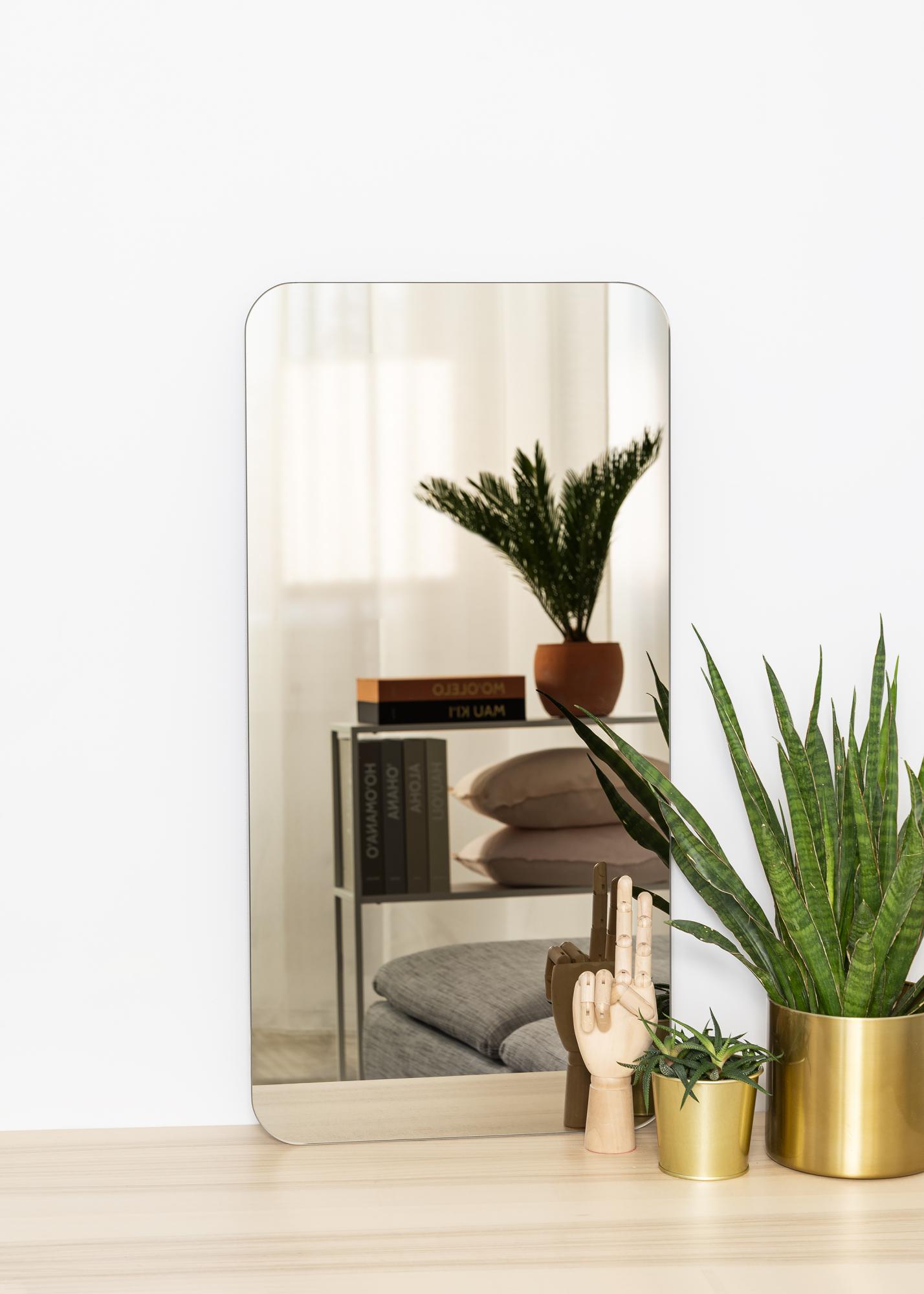 This is a rectangular mirror with decorative rounded corners that give a soft and elegant impression. The mirror glass is toned in a stylish shade of dark bronze, making this mirror a decorative detail that is both fashionable and striking. The mirror is also very thin and has no frame, further giving it a slender, stylistically simple feeling.