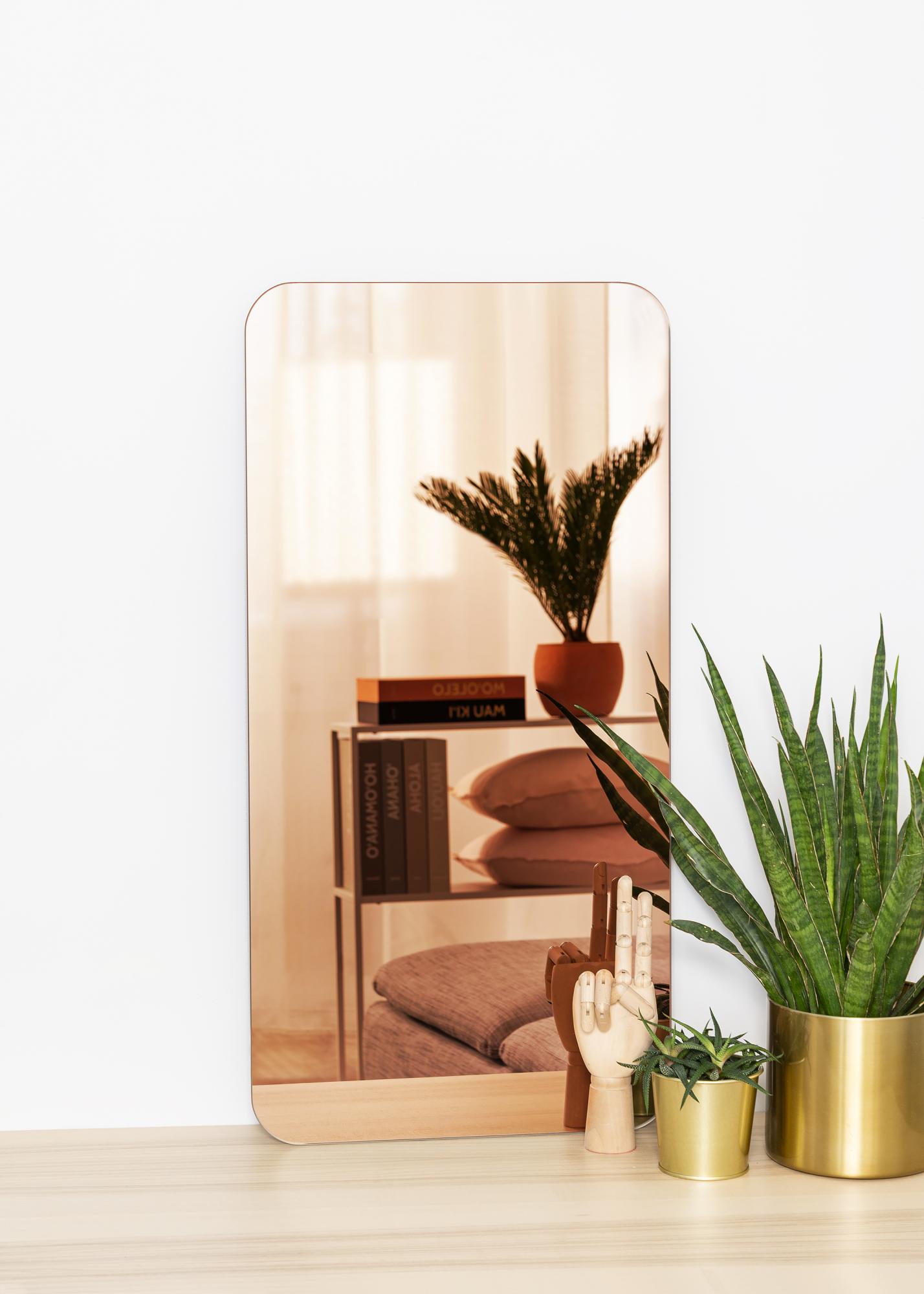 This rectangular mirror has been fitted with decorative rounded corners. This detail immediately softens the overall impression of the mirror and creates an elegant appearance. The mirror features rose gold-tinted mirror glass for an eye-catching and modern look. The mirror is frameless and only 4 mm thick, which adds to the trendy mirror design. A functional wall mirror and a trendy interior detail all in one!