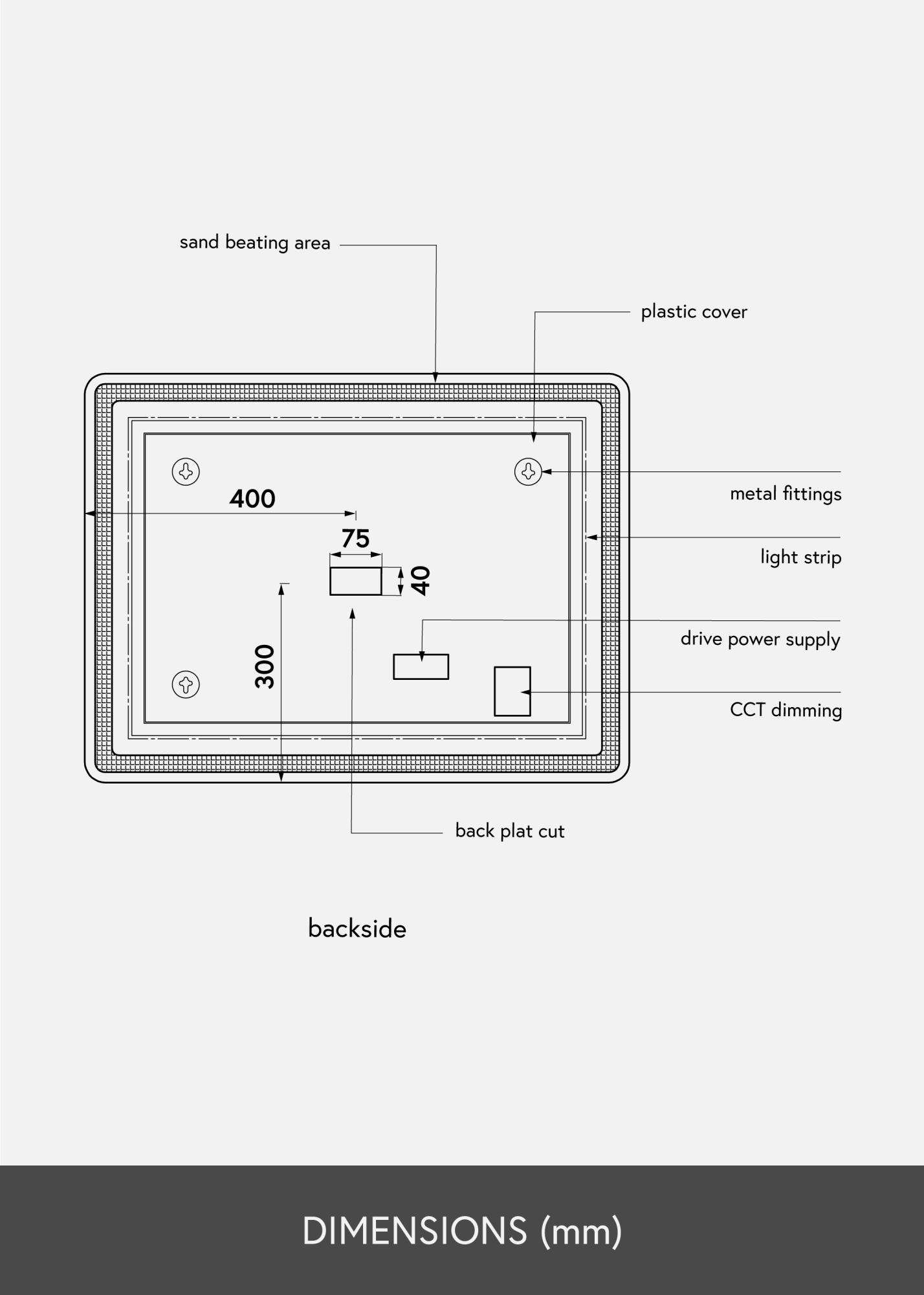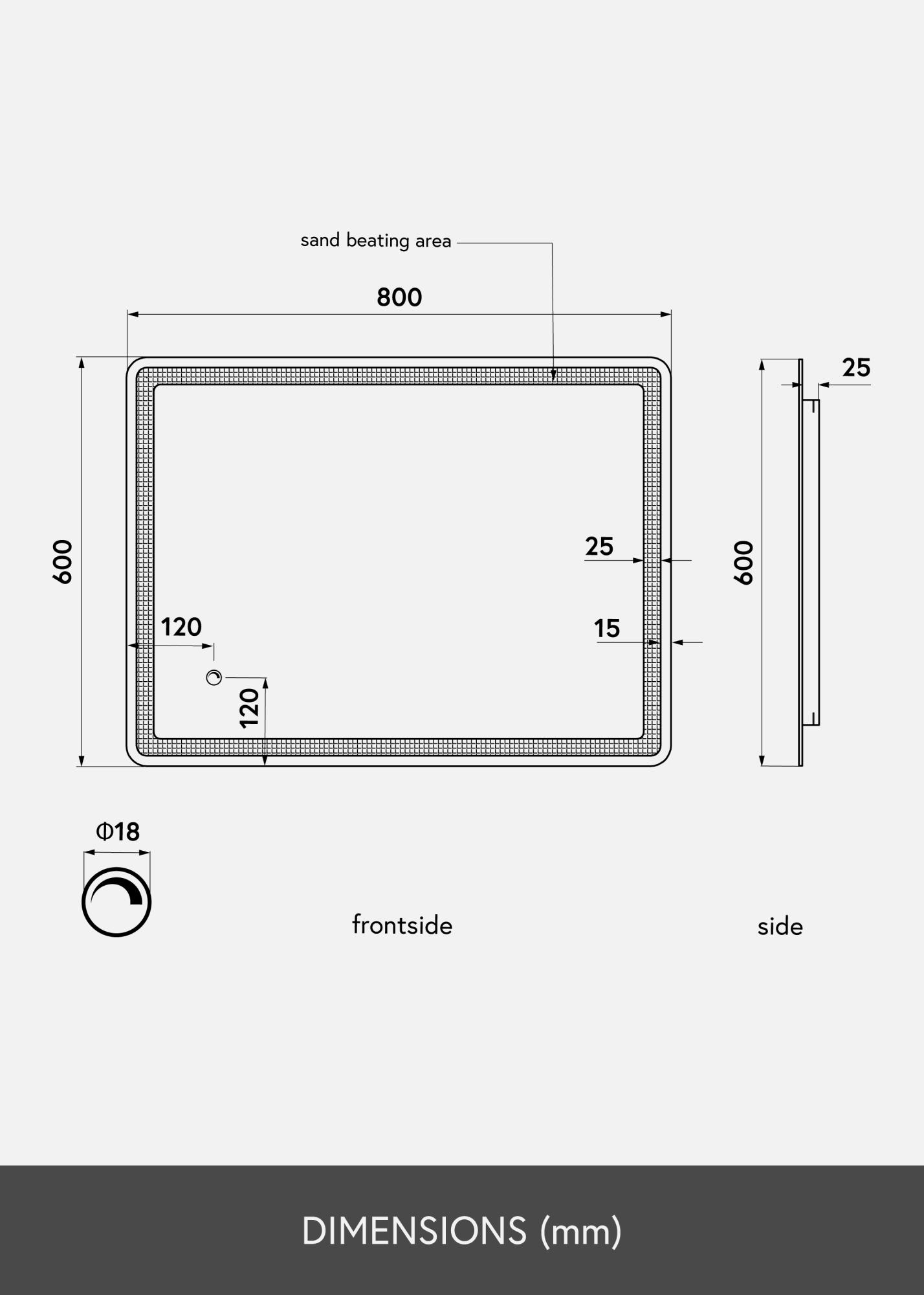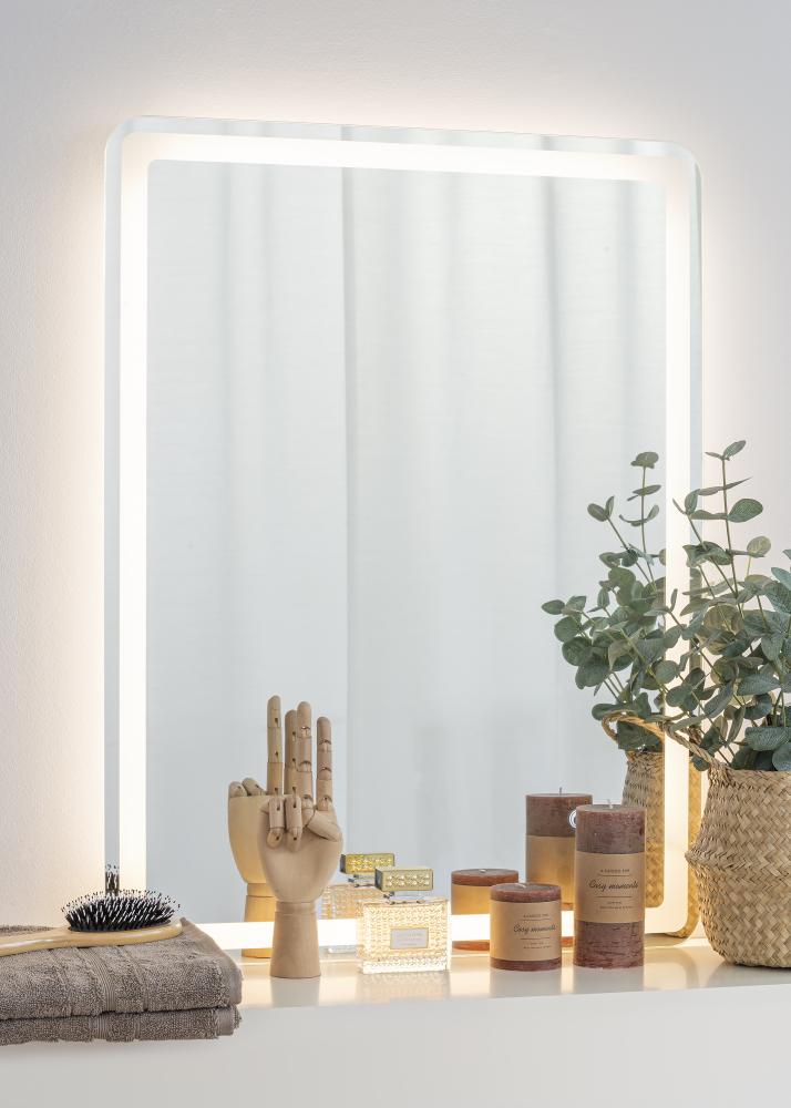 It measures 60x80 cm, and with the accompanying wall fixings you can mount it in both landscape and portrait orientations. The mirror is approved for bathroom use. It is intended for fixed installation and for connecting to a light switch. For the mirror to function correctly, it must be connected to a standard switch, not a dimmer switch.