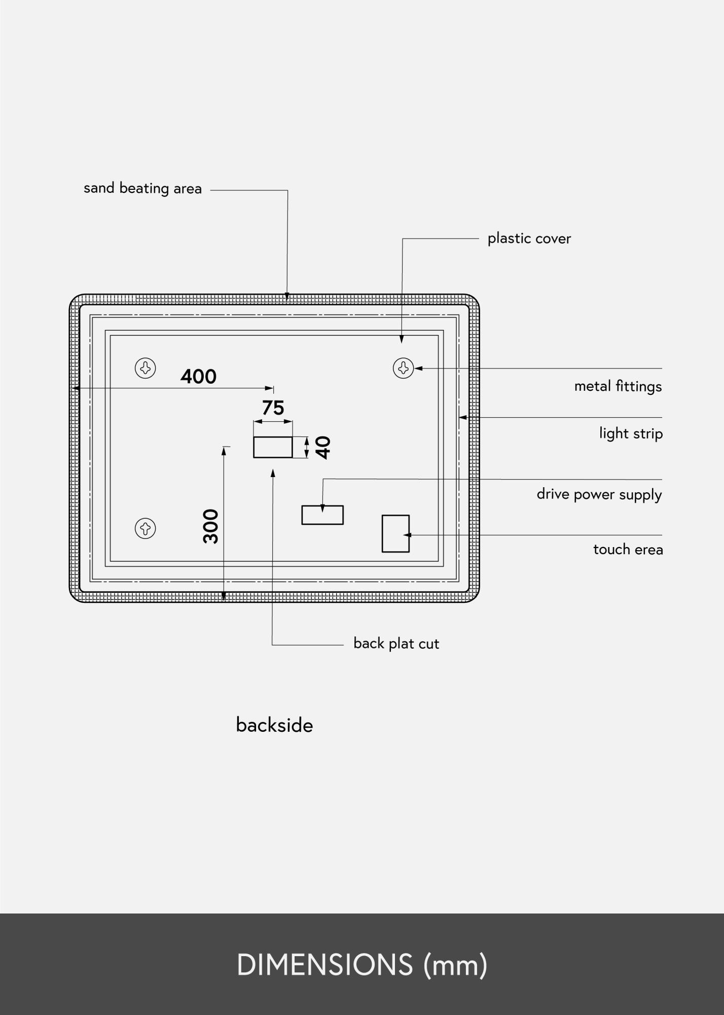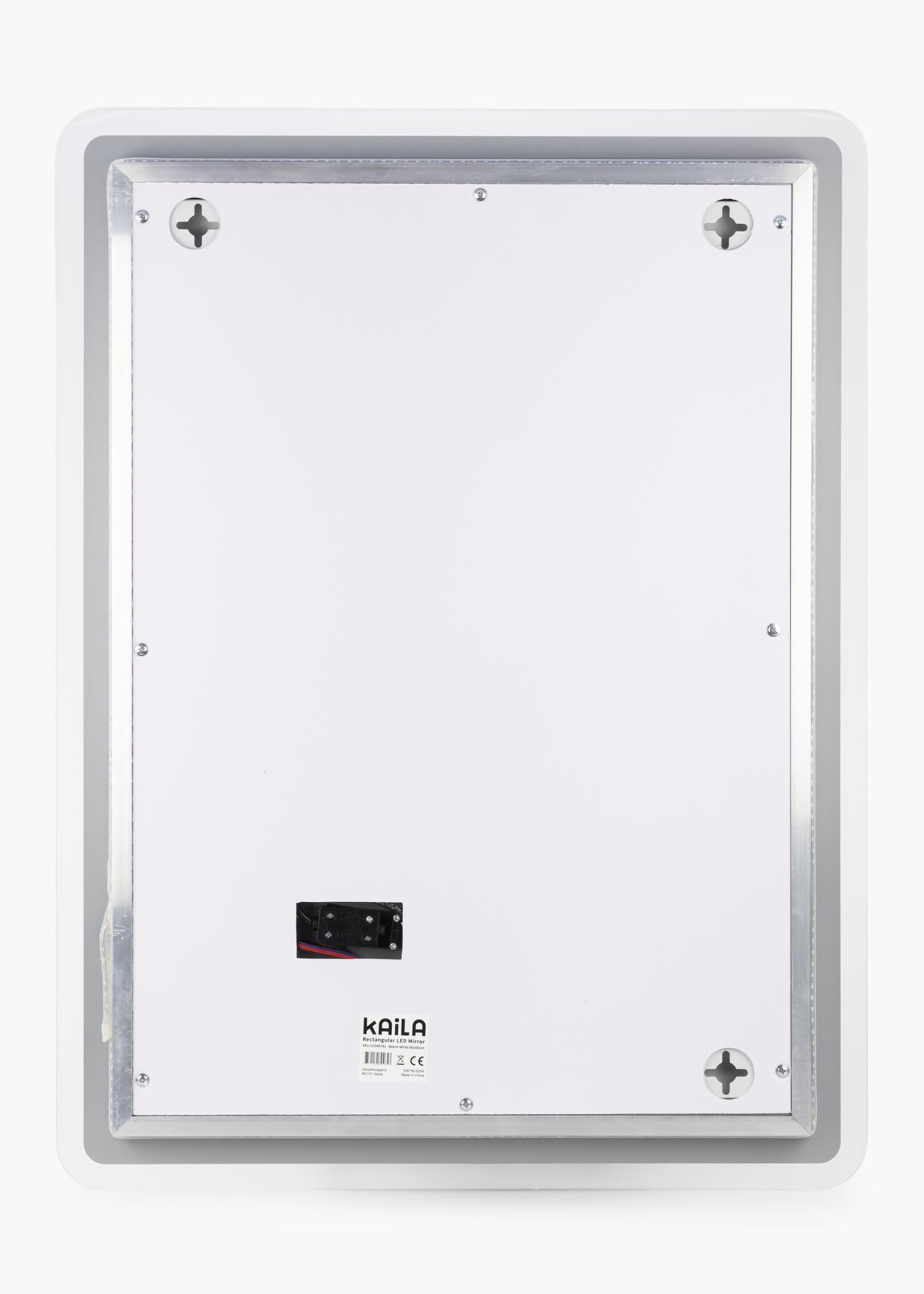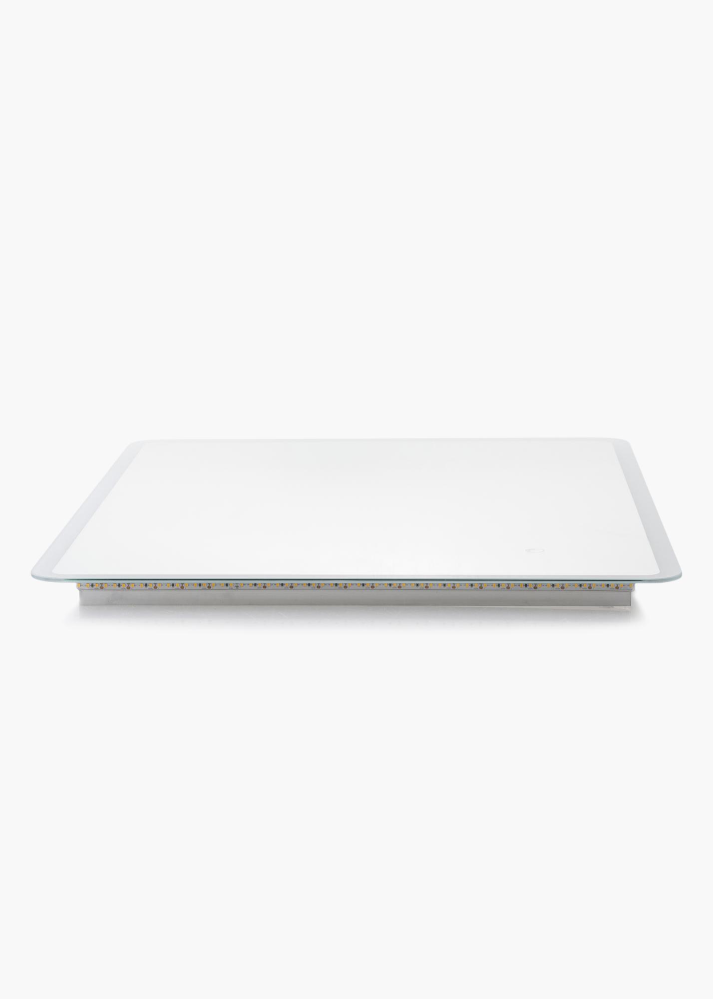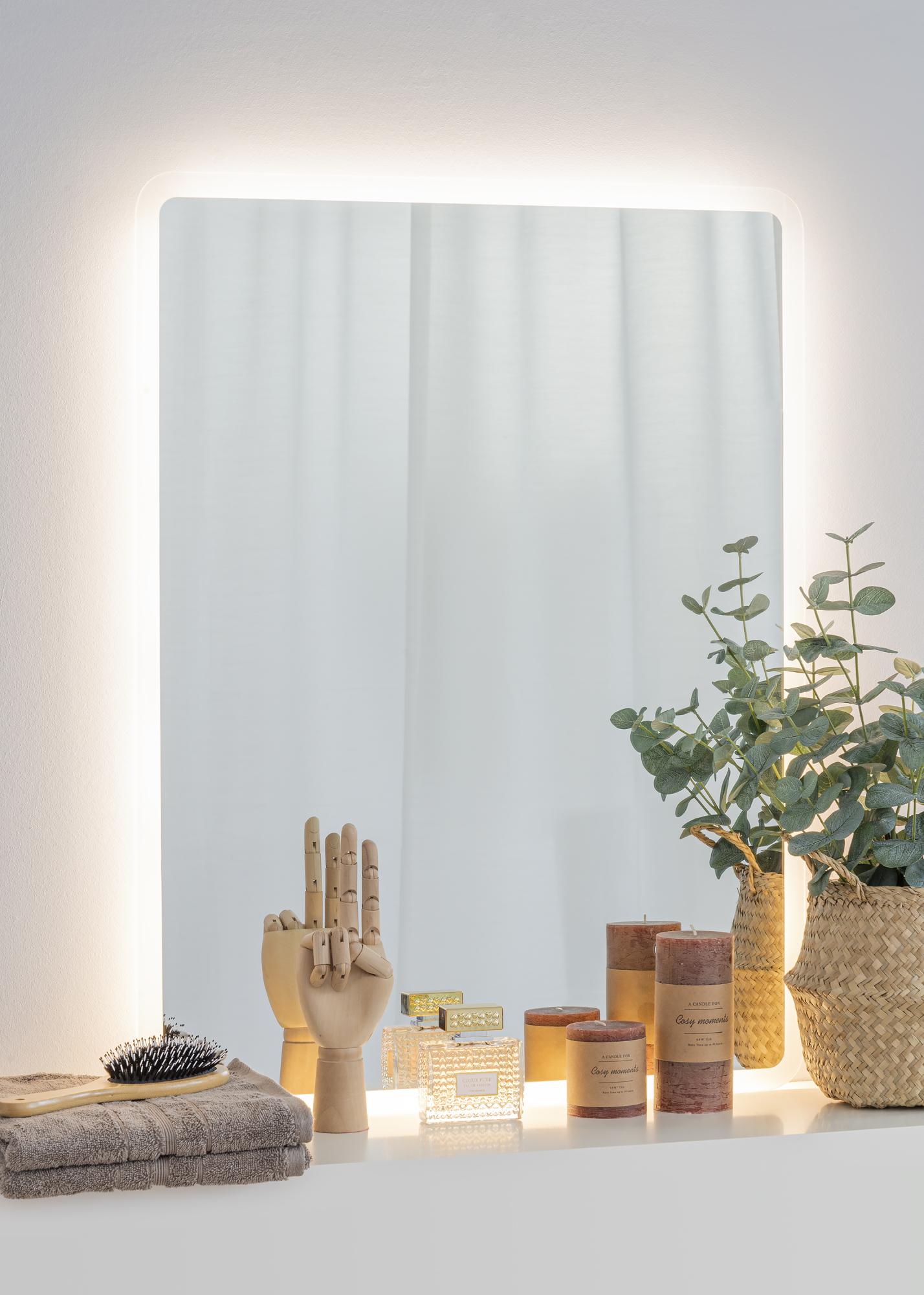This rectangular bathroom mirror with a timeless design has soft edges and rounded corners. Around the edges you’ll find integrated LED lighting, making for an attractive frame for the mirror. The LED lighting lights up the mirror from behind, giving it a lovely outward glow in a warm, white 3000K light. The lighting is dimmable, and you adjust the light strength by holding the button on the screen for a few seconds. The mirror remembers your most recent light setting for the next time you light it up. The mirror is approved for bathroom use. It is intended for fixed installation and for connecting to a light switch. For the mirror to function correctly, it must be connected to a standard switch, not a dimmer switch.