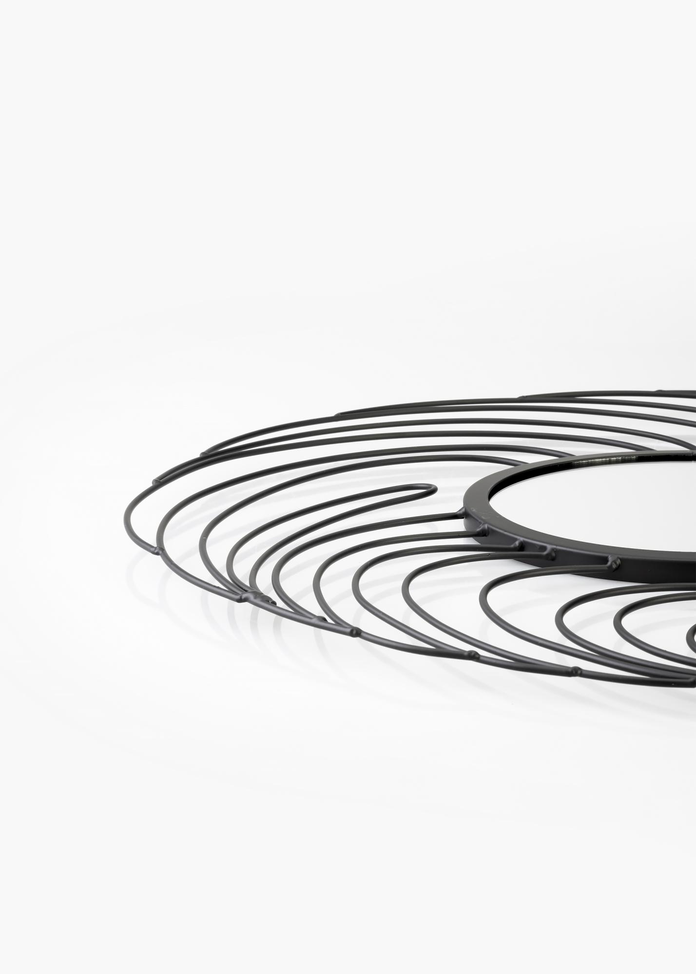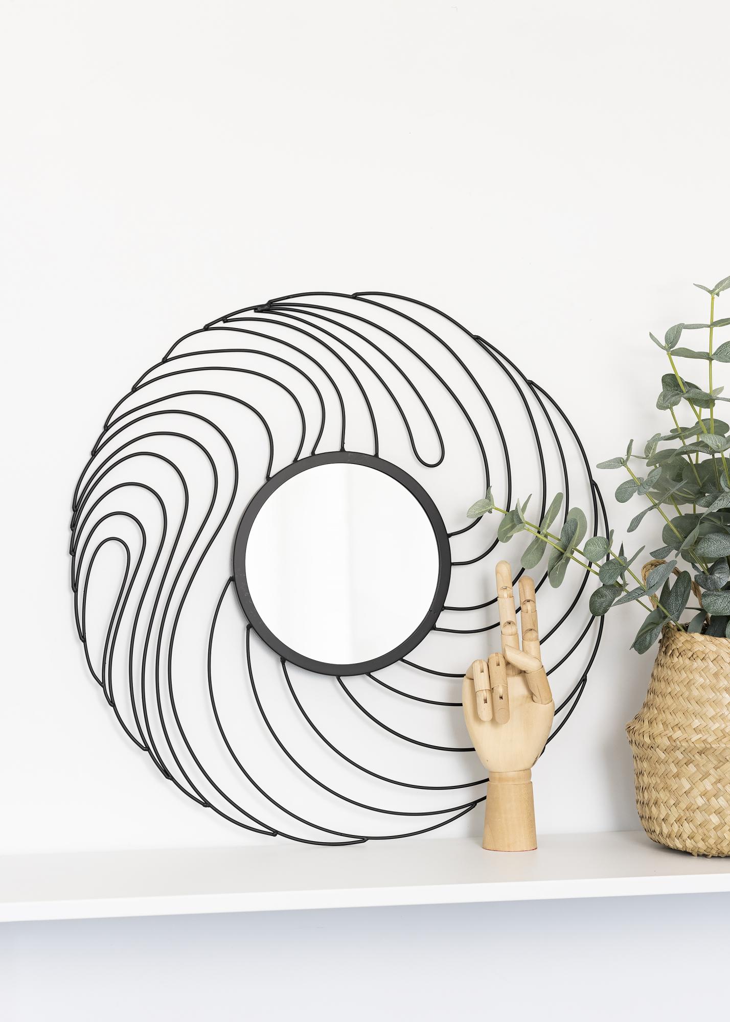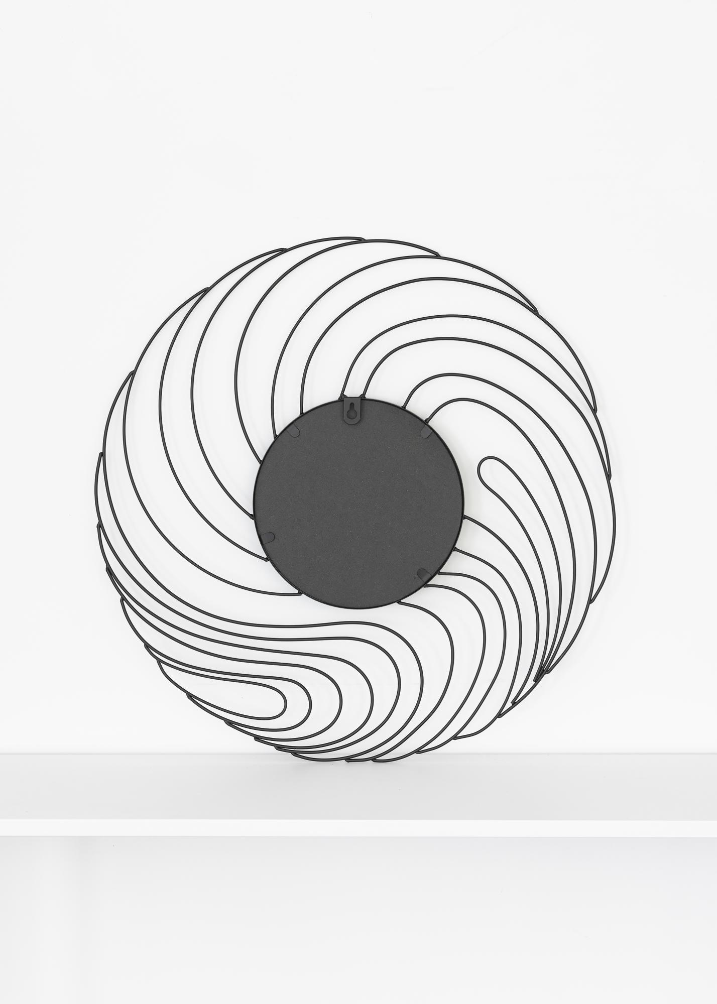 Storm is a wall mirror with a unique and cool design. This mirror is made from metal and has a diameter of 50 cm. Its small surface area is ringed in by a striking swirling black pattern. This mirror has colourless mirror glass and comes with wall fixings.