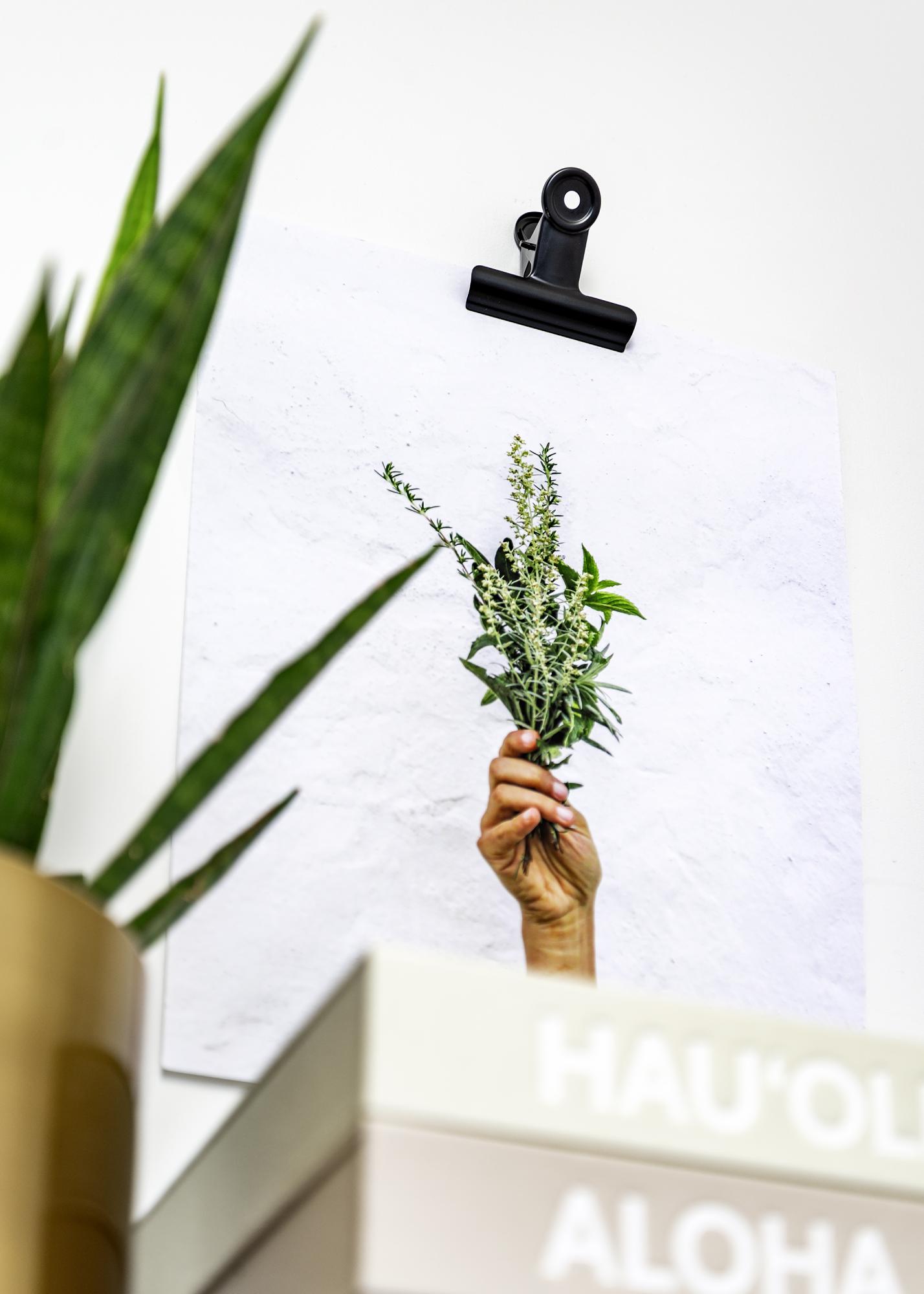 This black metal clip has an attractive matte finish and lets you hang your posters and prints in a chic and trendy way. The clip has a strong and sturdy grip, meaning that you can use it on both very thin paper as well as slightly thicker images. If you have a large poster that you want to hang up, you can choose to use two poster clips. The metal clip's design is stylistically simple, and the hole in the round top of the clip makes it simple and smooth to hang it up on the wall with a small nail or screw.