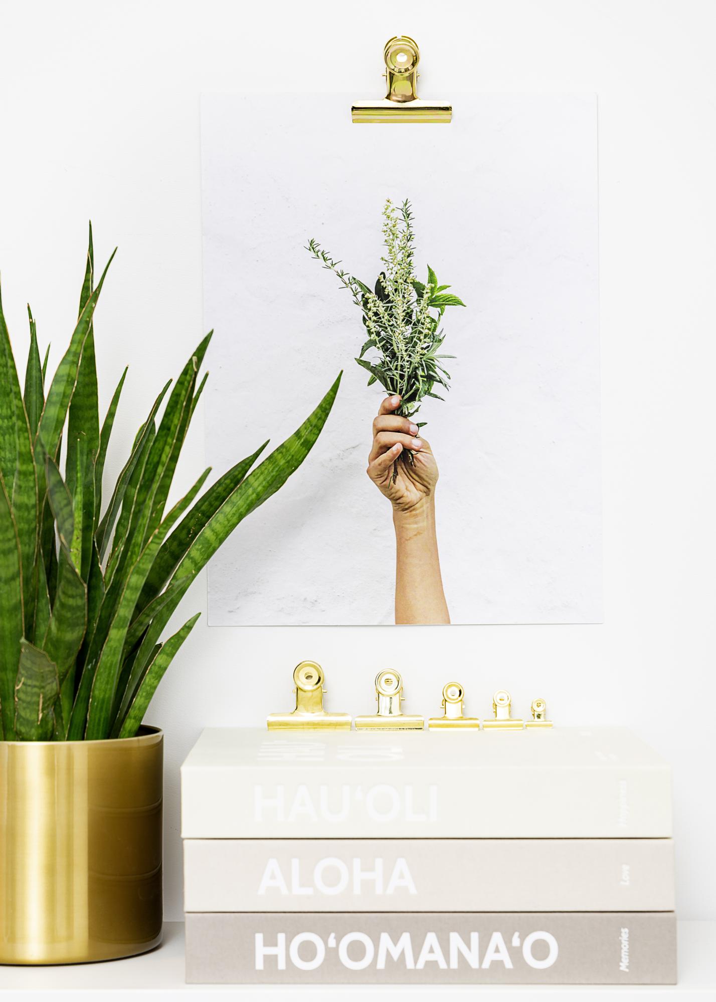 A metal clip in an elegant and glossy golden finish that allows you to hang your posters and prints in a fashionable and minimalistic way. The poster clip's design is stylistically simple, and the holes in the round top of the clip make it simple to hang it up on the wall with a small nail or screw. The clip has a strong grip, meaning that you can use it to hang up both very thin paper, while also being flexible and allowing for mounting images of varying thickness. If you have a large poster that you want to hang up, use two metal clips for the best result.