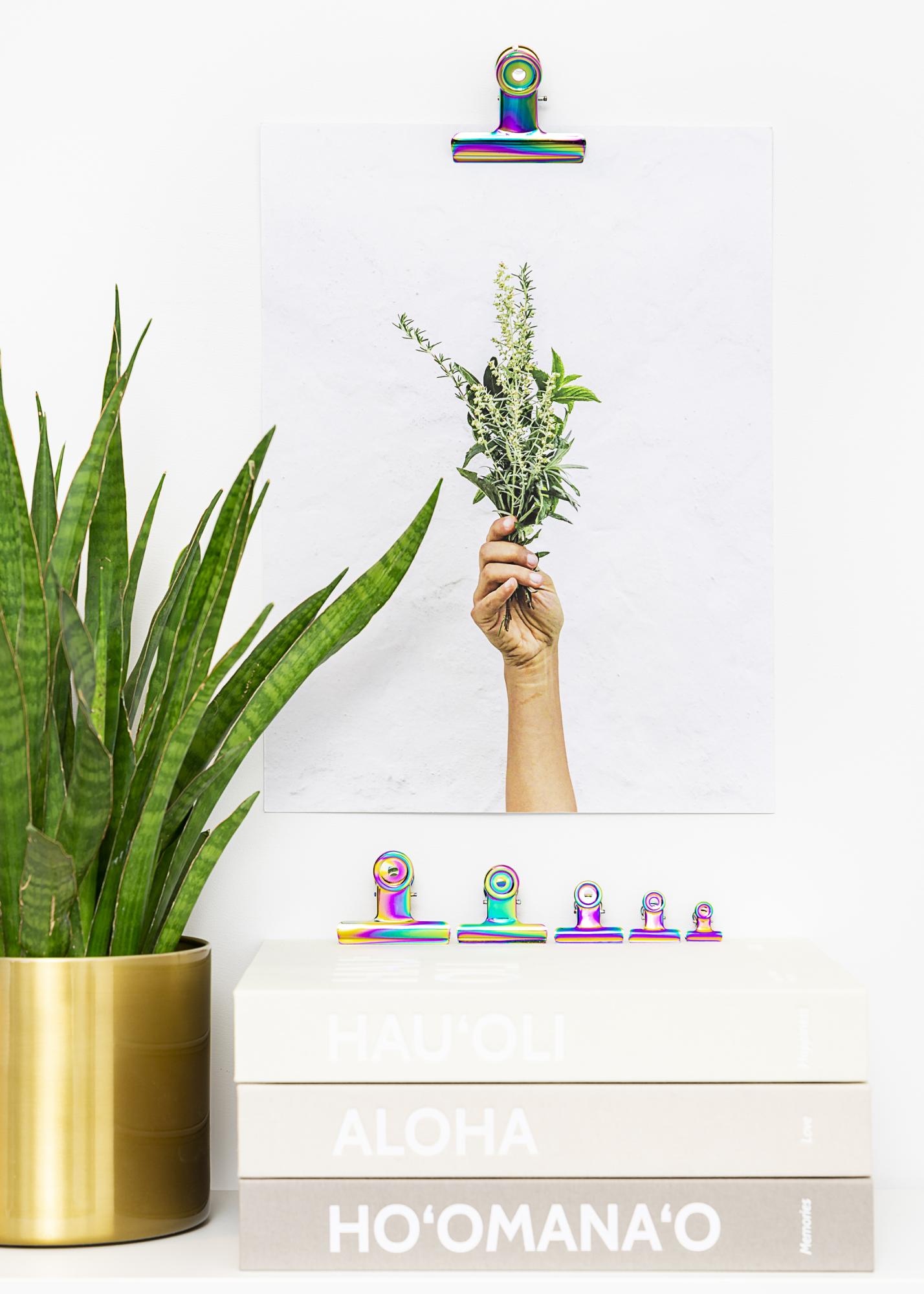 A divine rainbow-coloured metal clip with a glossy finish that lets you hang up your posters and prints in trendy and unusual way. The poster clip's strong, but flexible, grip means that you can use it on both the very thinnest of paper as well as posters with a heftier thickness. If you have a large poster that you want to hang up, you can choose to use two poster clips. The poster clip's design is simple and pared-back, and thanks to the holes in the round top of the clip, it's simple to put it up on your wall with the help of a little nail or screw.