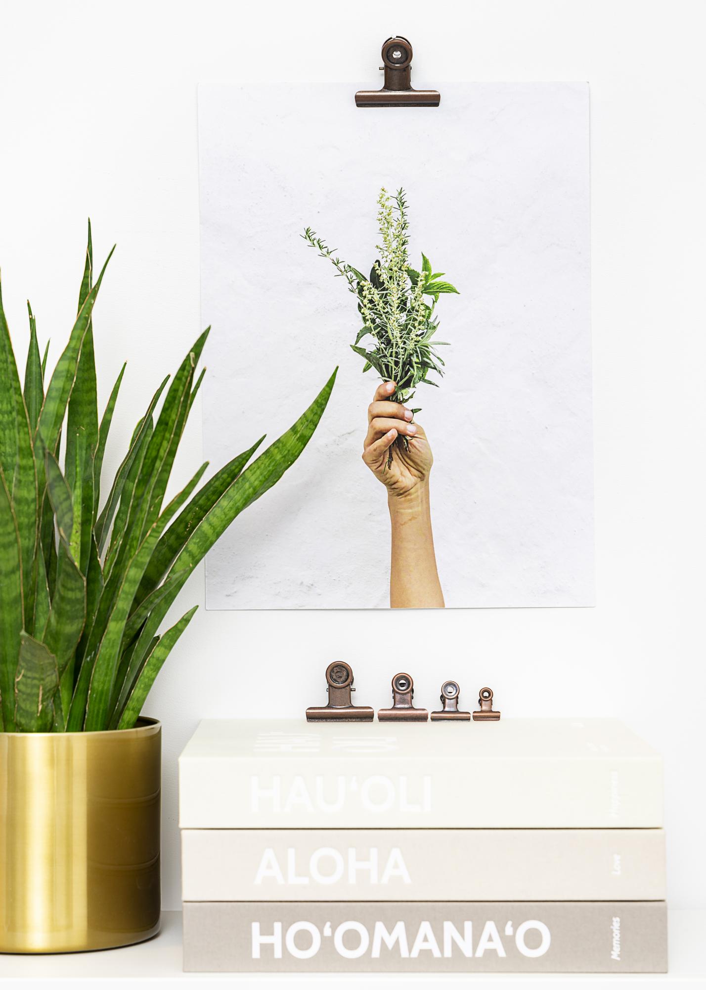 This is a metal clip in a rustic style with beautiful worn brass, giving you a trendy way to hang up your posters and prints. It's also very simple to mount the clip on your wall, thanks to the holes in the elegant round top of the clip. The clip's opening has a flexible but strong grip, allowing you to use it to hang both thin paper and slightly thicker posters. And if you want to hang a larger poster, all you need to do is use two clips.