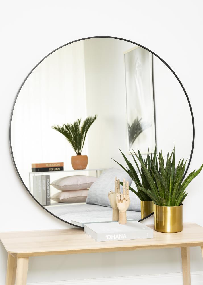 KAILA Round Mirror Edge Black is a round mirror with a thin, stylish metal frame in matte black that gives it a trendy, industrial appearance. The frame has a depth of between 30 and 40 mm depending on the size you choose, which means that it stands slightly off the wall, giving it a cool 3D effect. The depth of the frame also makes the mirror feel solid without affecting its minimalist appearance. A perfect round mirror to place in any room to which you want to bring function and stylish Swedish design!
