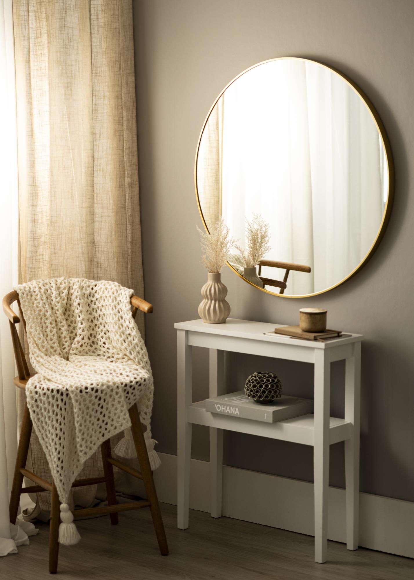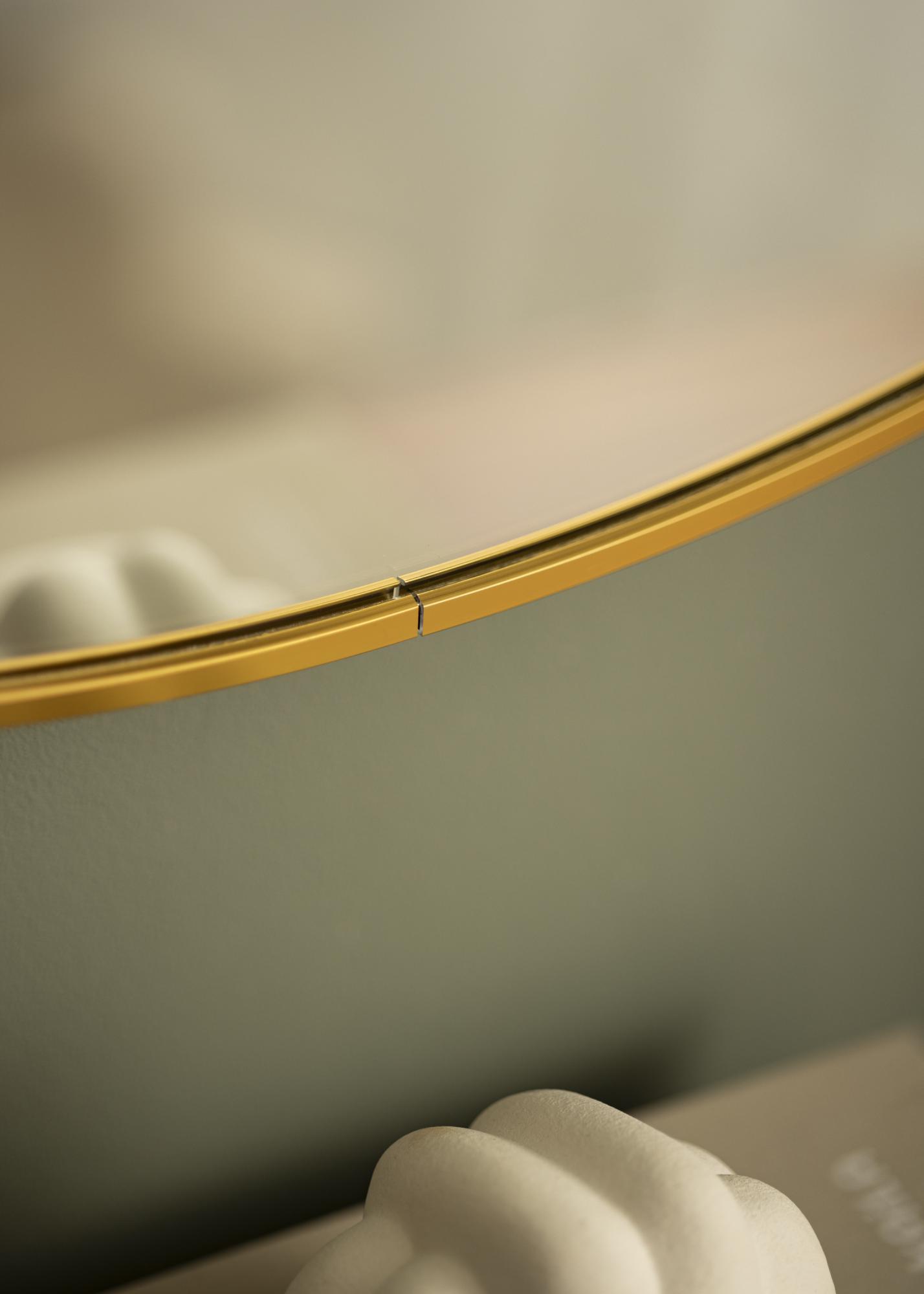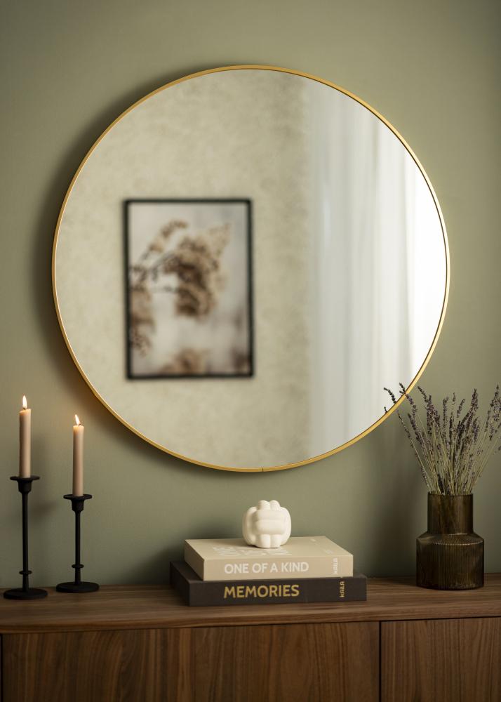 A round mirror in a stylish Swedish design with a metal frame in beautiful gold. The frame has a brushed surface, which gives the lovely gold colour a slightly duller look. It also has a trendy frame that's thin but at the same time deep - between 30-40 mm deep depending on the size - meaning that it stands slightly off of the wall for a cool 3D effect. The frame's depth also makes the mirror feel solid and robust, without affecting its minimalist feel.