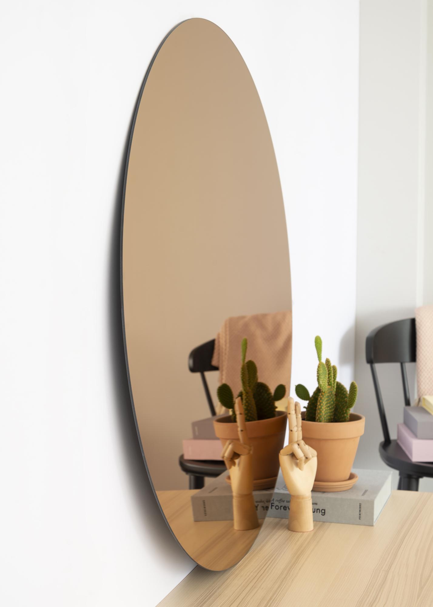 This round mirror is something special! This elegant and stylish mirror is designed in a soft shape and is frameless and very thin. The mirror features rose gold-tinted mirror glass which looks trendy in your home.