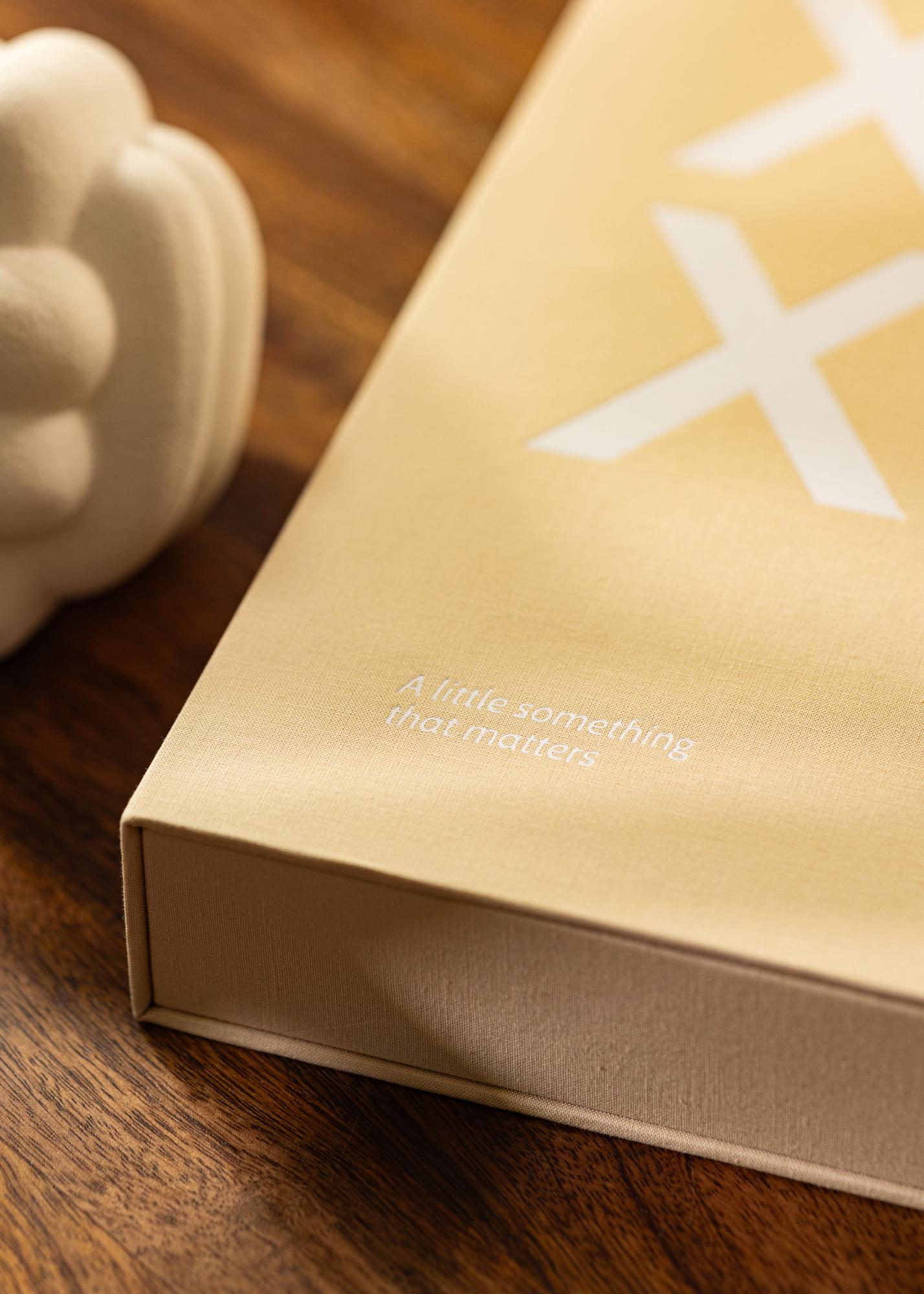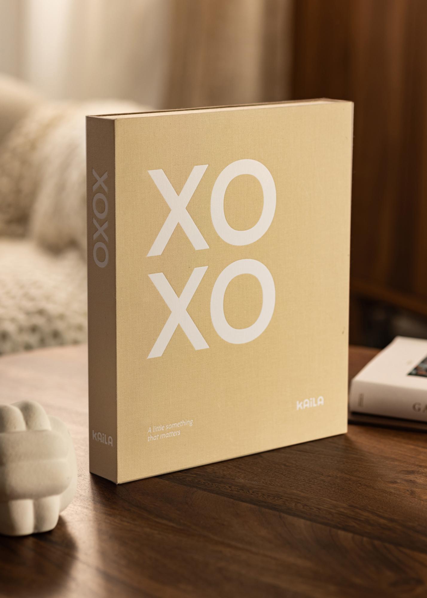 This attractive photo album is designed like a fashionable coffee table book - which is why it’s called a coffee table photo album. The cover is elegantly wrapped in beige cloth, and on the front and spine of the album are printed with the white text “XOXO” - hugs and kisses. This fashionable title is complemented by a subtitle that says “A little something that matters”, printed in the lower left corner. This is a very fashionable photo album with a slightly different and playful design that’s sure to stand out from the crowd.