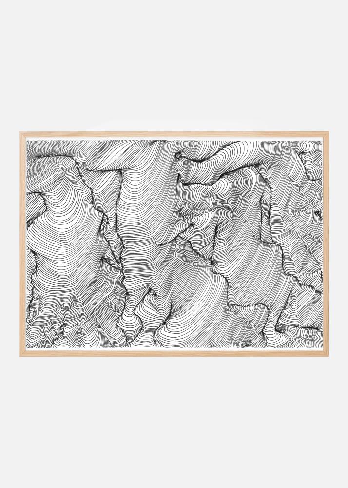 An abstract art poster in black ink with undulating lines that create exciting shapes, created by Belinda Hellberg, Hells Bells Sthlm. The motif is surrounded by a slightly thinner white mount that effectively highlights its content. A simple and stylish poster that is easy to combine with other favourites on a larger picture wall.