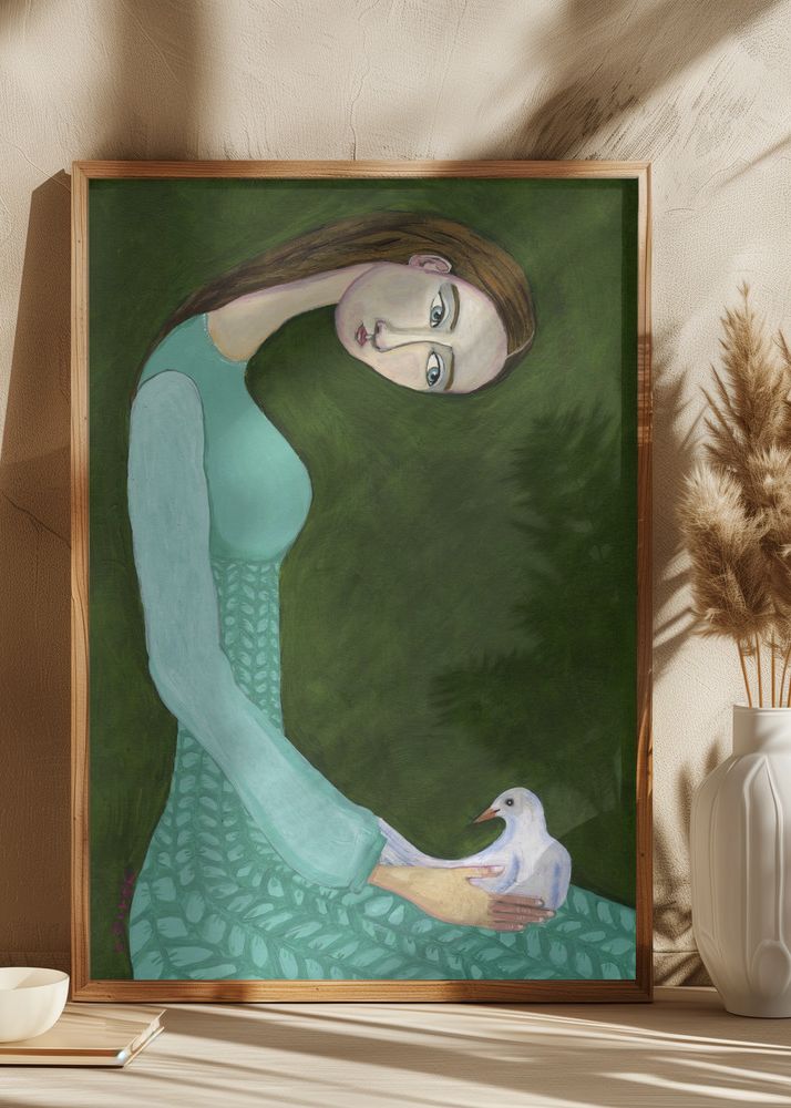 https://www.bgastore.uk/Lady-sitting-with-white-dove-bird-woman-Poster-50x70-cm