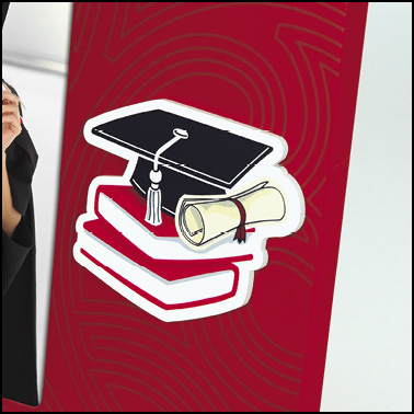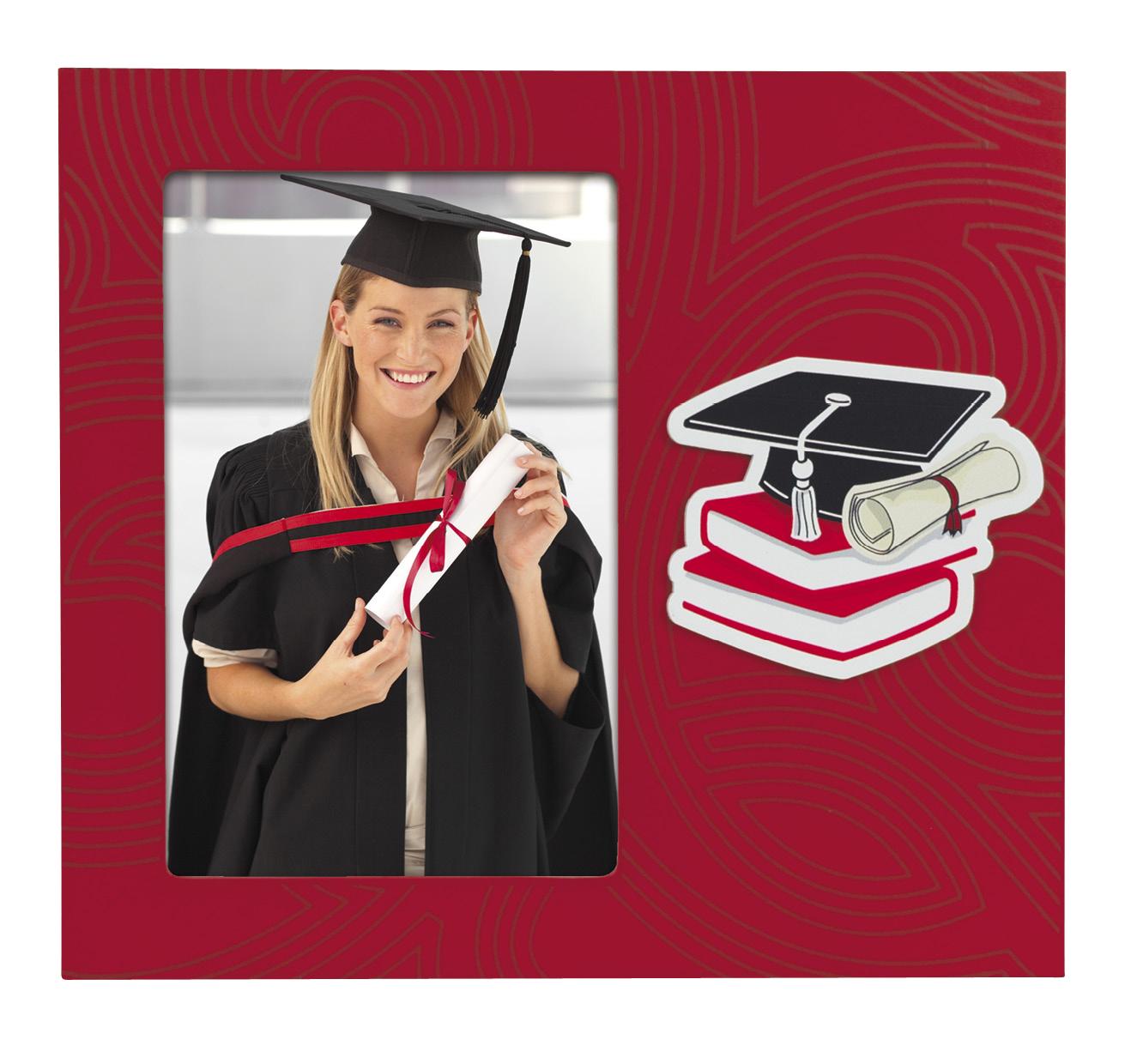 Let a wonderful photo of the proud graduate adorn your bookshelf or desk! This decorative picture frame comes in red, with a discreet pattern and a picture window measuring 10x15 cm. Next to the picture window is a slightly-raised image of an American graduation cap and a diploma, on top of a pile of books.
