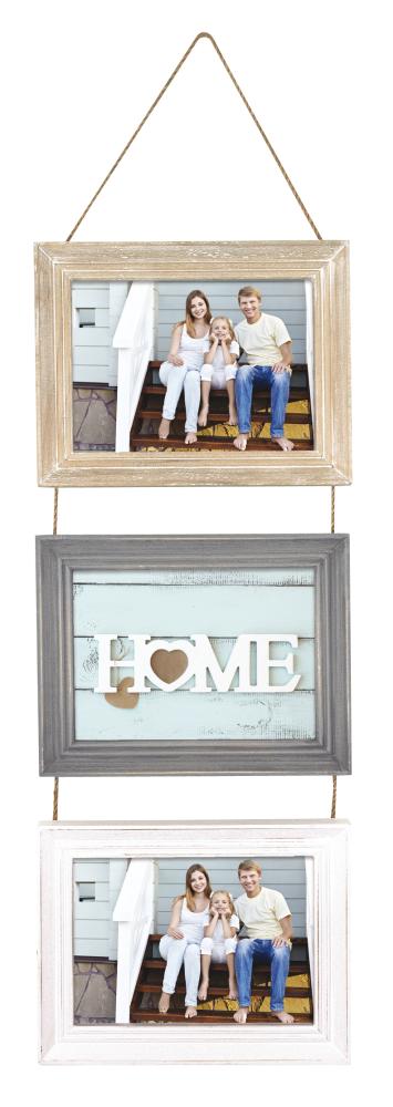 Fill your home with framed photos of loved ones for a warm and cosy atmosphere. This rustic collage picture frame holds three of your best landscape photos, in the format 10x15 cm. The picture frames come in distressed, wood-coloured grey and white. They are held together with a thin, decorative cord that is also used for straightforward hanging.