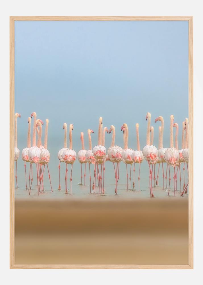 A spectacular print of a flamboyance of flamingos on the water edge. The wonderful creatures are caught from behind and their colour is enhanced by the neutral tones of the sky and sand. Ideal to be placed in a bedroom for its suggestive delicacy.