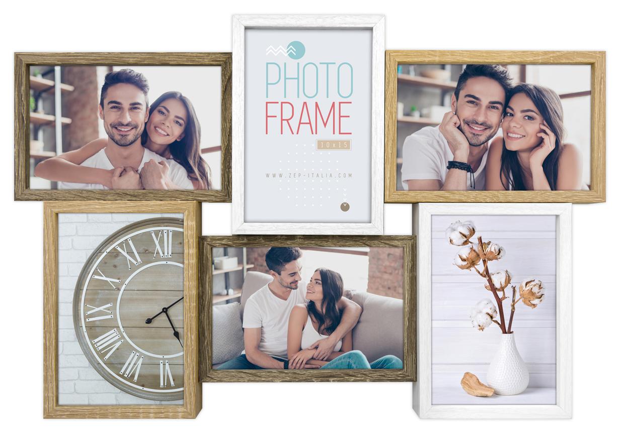 Attractive collage picture frame made from wood. This picture frame has several different colours, but has a consistently stylistically simple design with slender edges and natural shades. Why not gather six of your favourite photos and immortalise them in this picture frame? That way, you'll always be able to look back over them fondly! This collage picture frame has space for 6 pictures measuring 13x15 cm. Comes with wall fixings.