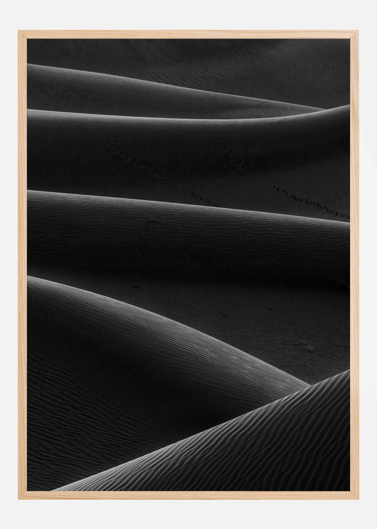 A stunning black image of sand dunes in the desert. The rippling sand is highlighted by natural light falling on the dunes creating an edge like effect. A stunning yet silent image to hang on a white wall to give that sense of immensity.
