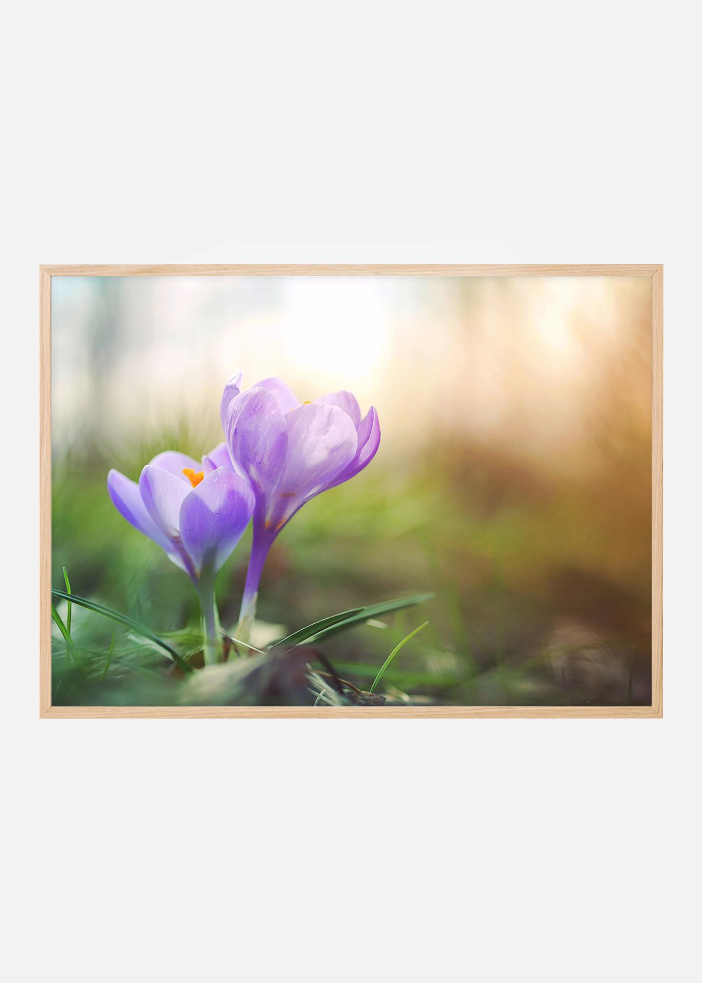 A charming picture of perhaps the most colourful sun worshipper of spring, the crocus. The blurred background in a complementary colour lifts the flowers and brings harmony to the photograph. Suitable for those who want joy of colour in their home and it's always nice to use a shade from the painting as an accent colour in the rest of the decor. Feel free to combine with other plant motifs to create a cohesive feel in the room.
