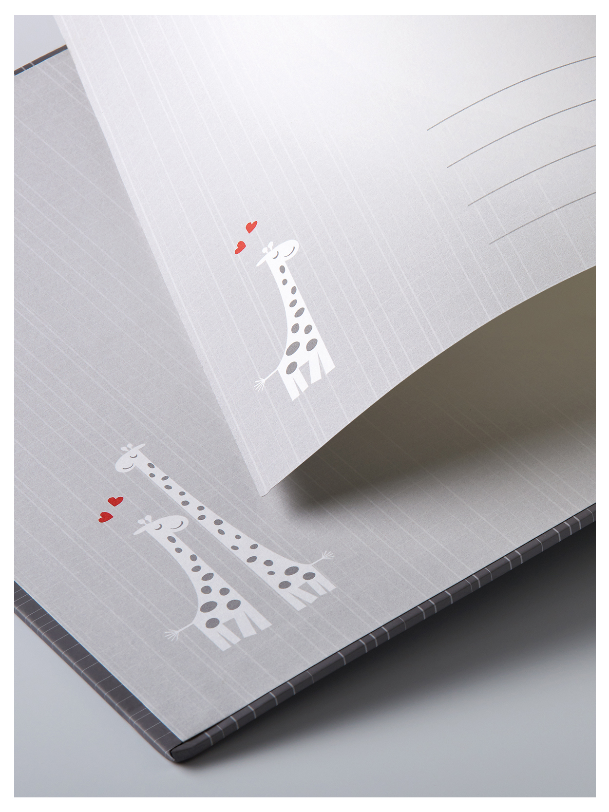 This bound album has a grey and white front cover with a giraffe motif. The first page is also decorated with cute giraffes, and has space for text.
