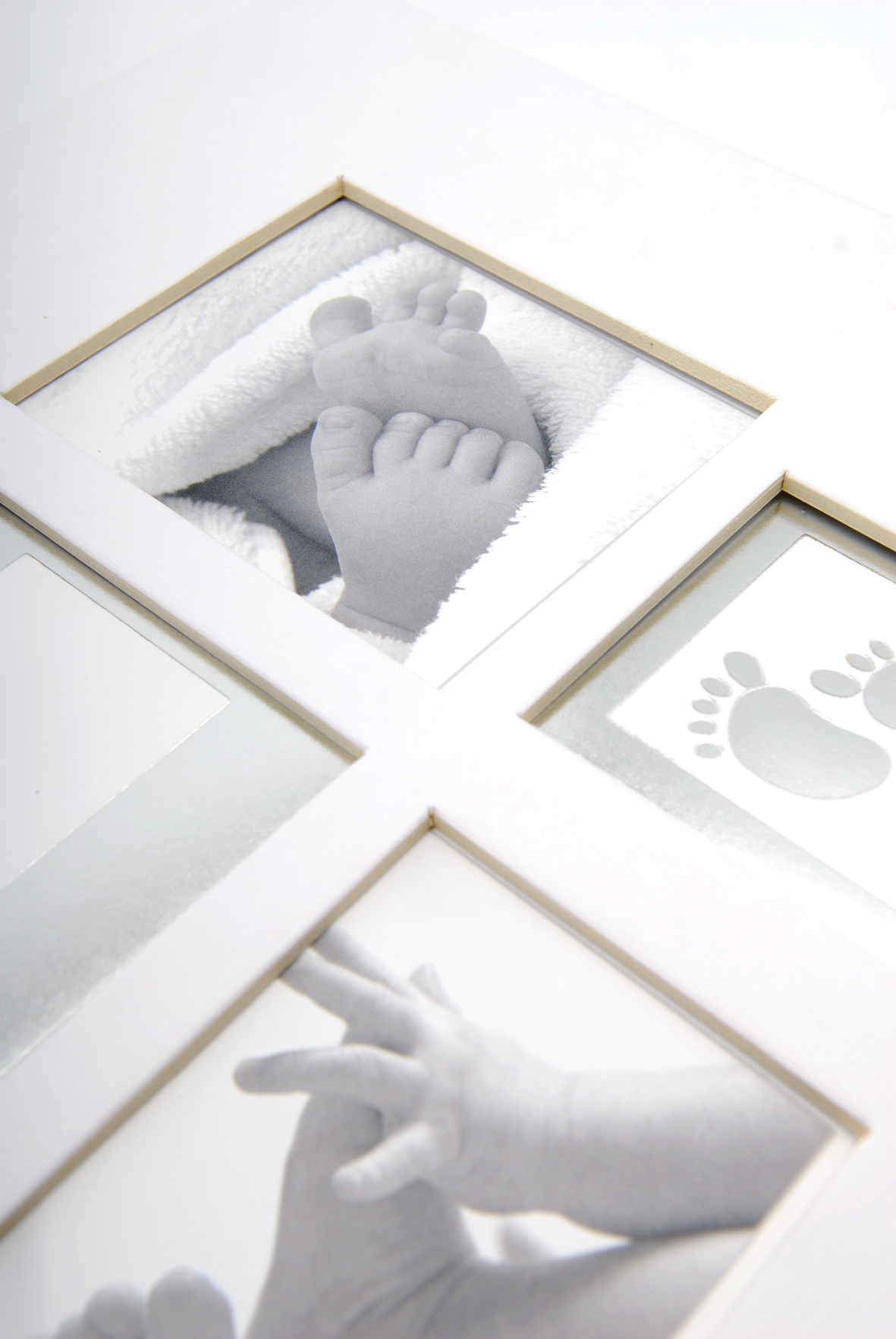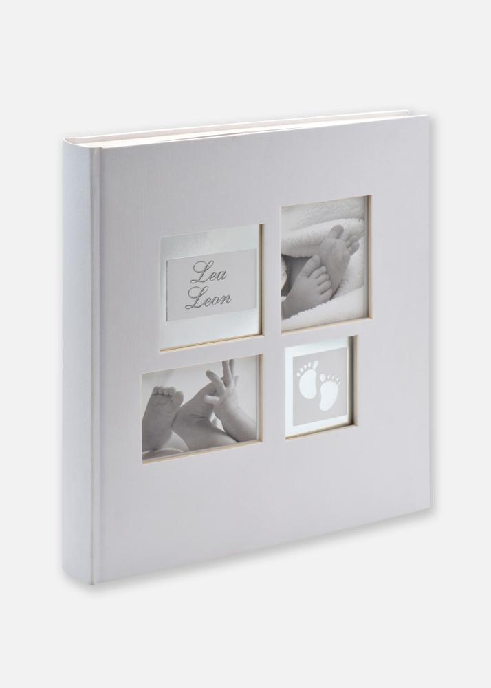 Elegant baby album in white with a light grey tone, and space for 4 pictures on the front of the album. Perfect when you want to create your own personal baby album for your favourite photos.