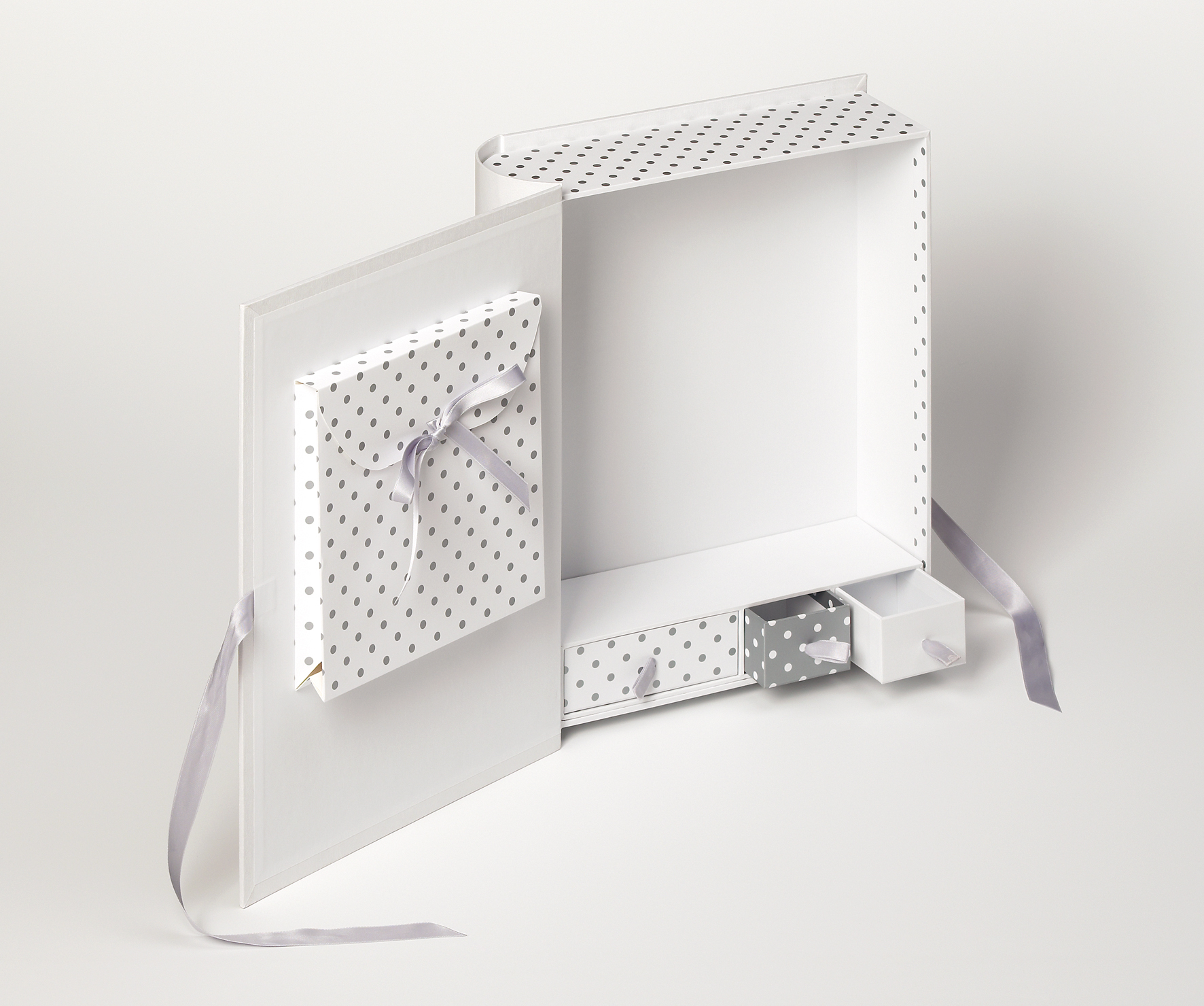 Delightful storage box for pictures and small objects. The box contains 3 small drawers that are ideal for keeping baby’s first tooth, for example. There is also a storage bag that you can close. You can put one of your own pictures on the front of the box, to add your own personal touch.