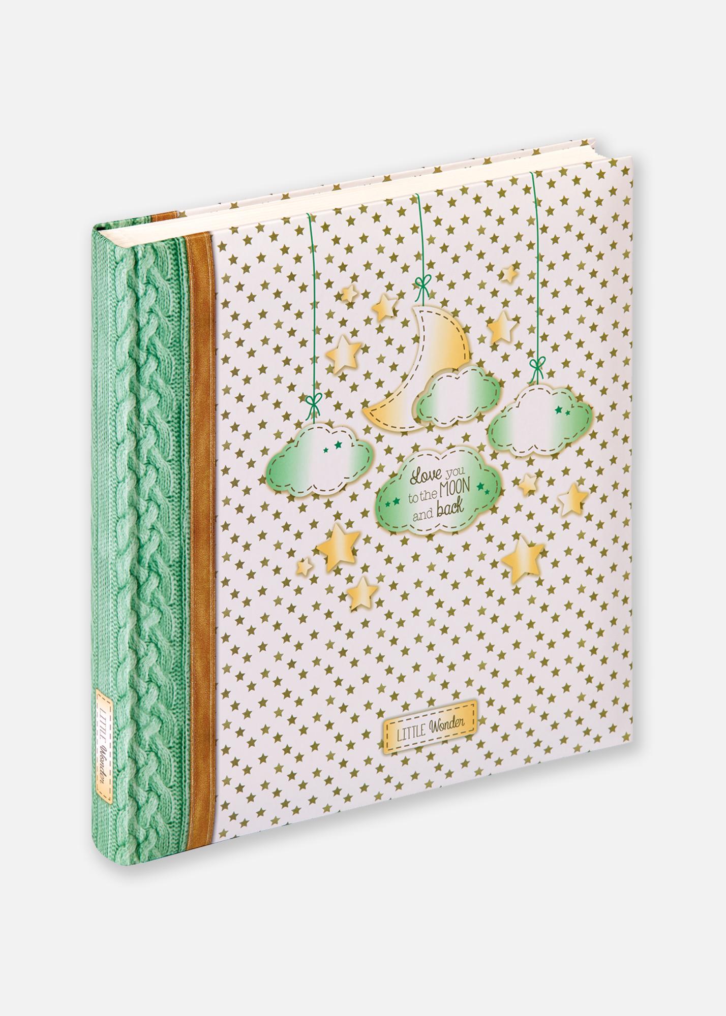 This photo album has a white front adorned with stars, clouds and the moon. Towards the spine is a green braided pattern. In the centre are the words "Love you to the moon and back" complete the design. The album's first pages are decorated in the same style and have space for text.