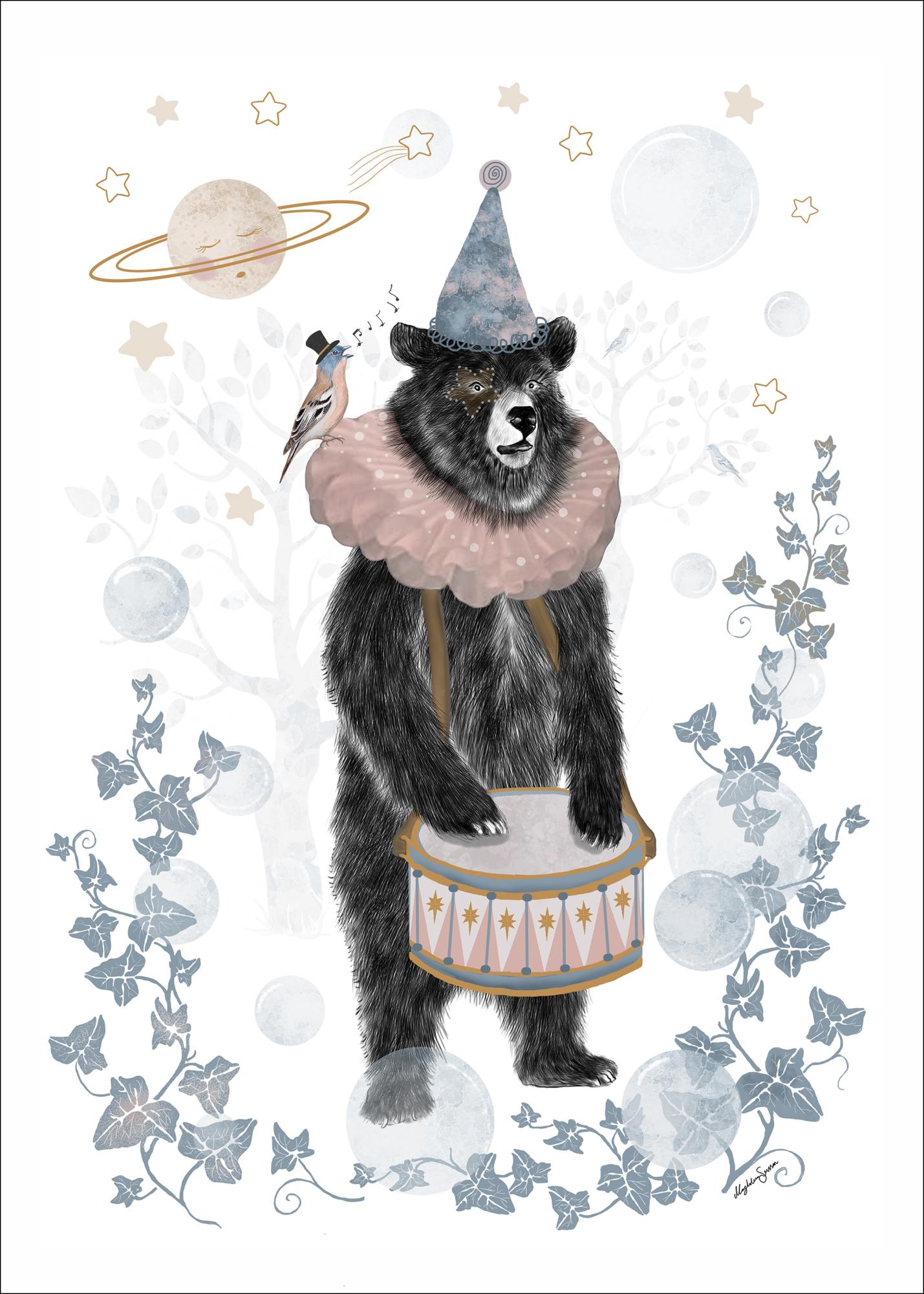 A fun image of a brown bear playing a drum. With a soft brown image of Saturn looking down on this bear, the image is covered in grey ivy leaves and light brown coloured stars. The pale pinks of the drum and bear collar enhance the beauty of the bird sitting on the bear's shoulder. Beautiful for a child's room.