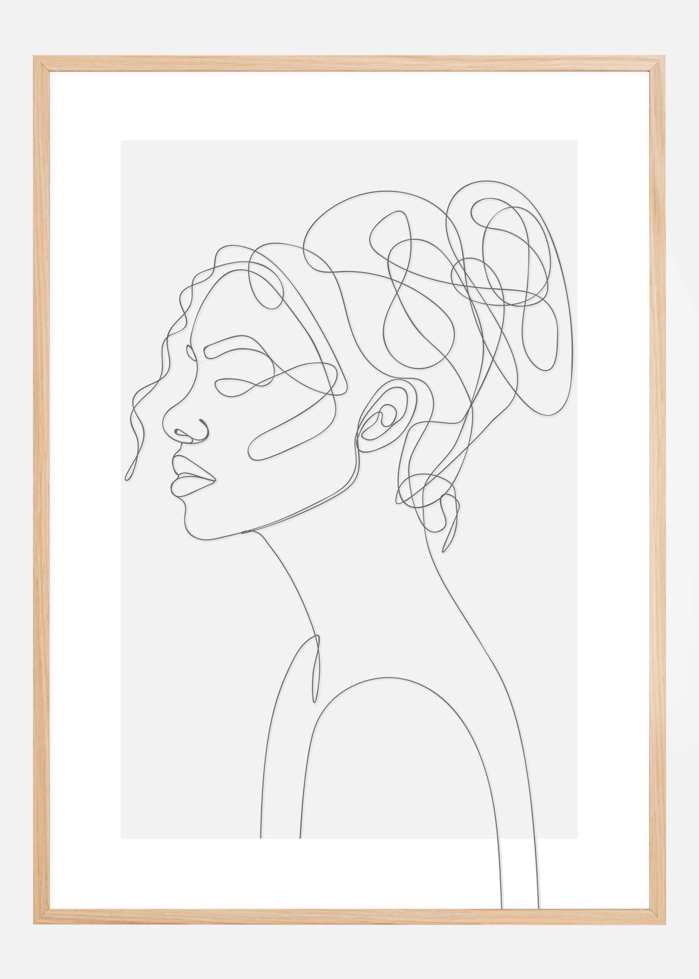 This is a striking line drawing of a woman's bust looking to the left of the canvas. Her curly hair tied up into a bun at the top of her head. Each line cleverly flows to the next without ever leaving the print as a symbol of the character's life. One beginning, one end. A beautiful yet mysterious print for any environment.