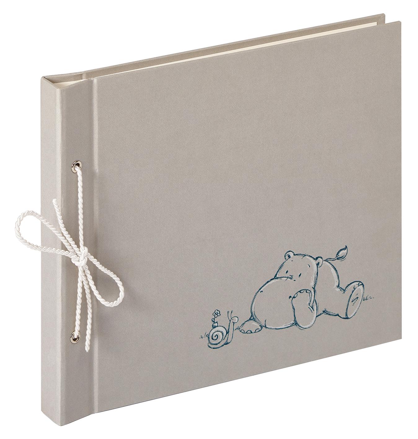 A cute little person requires a photo album that is just as cute! Here we have a stylish baby album that is coated in grey textile and decorated with a white bow, that is threaded through silver-coloured eyelets. On the front there is a cosy image in the form of a small hippopotamus wiggling its tail and a snail with a flower on its shell. Inside you will find 50 creamy white pages that you paste your pictures on. On each page there is the same delightful hippopotamus next to 4 lines, where you can write your comments.