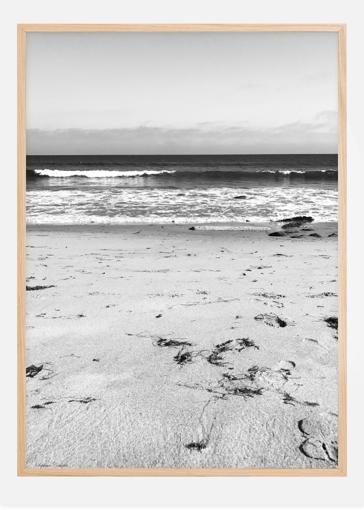 A black and white nature photograph where foaming waves wash over a tranquil beach. A few light footprints in the sand are the only signs of human presence. A calm and harmonious poster created by photographer Saphira Consilio.