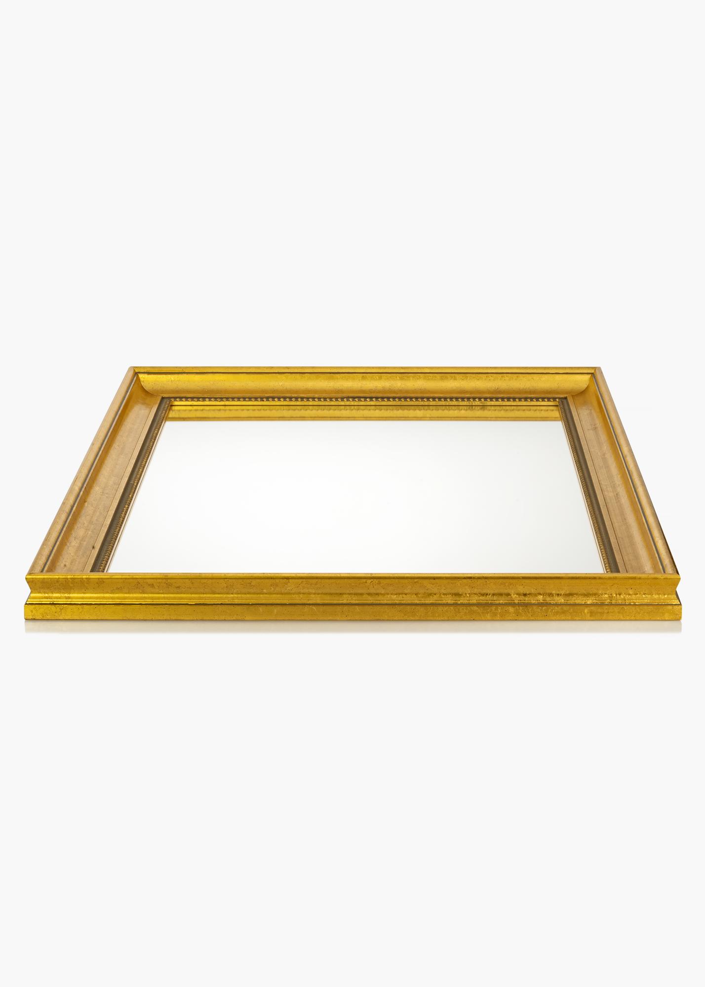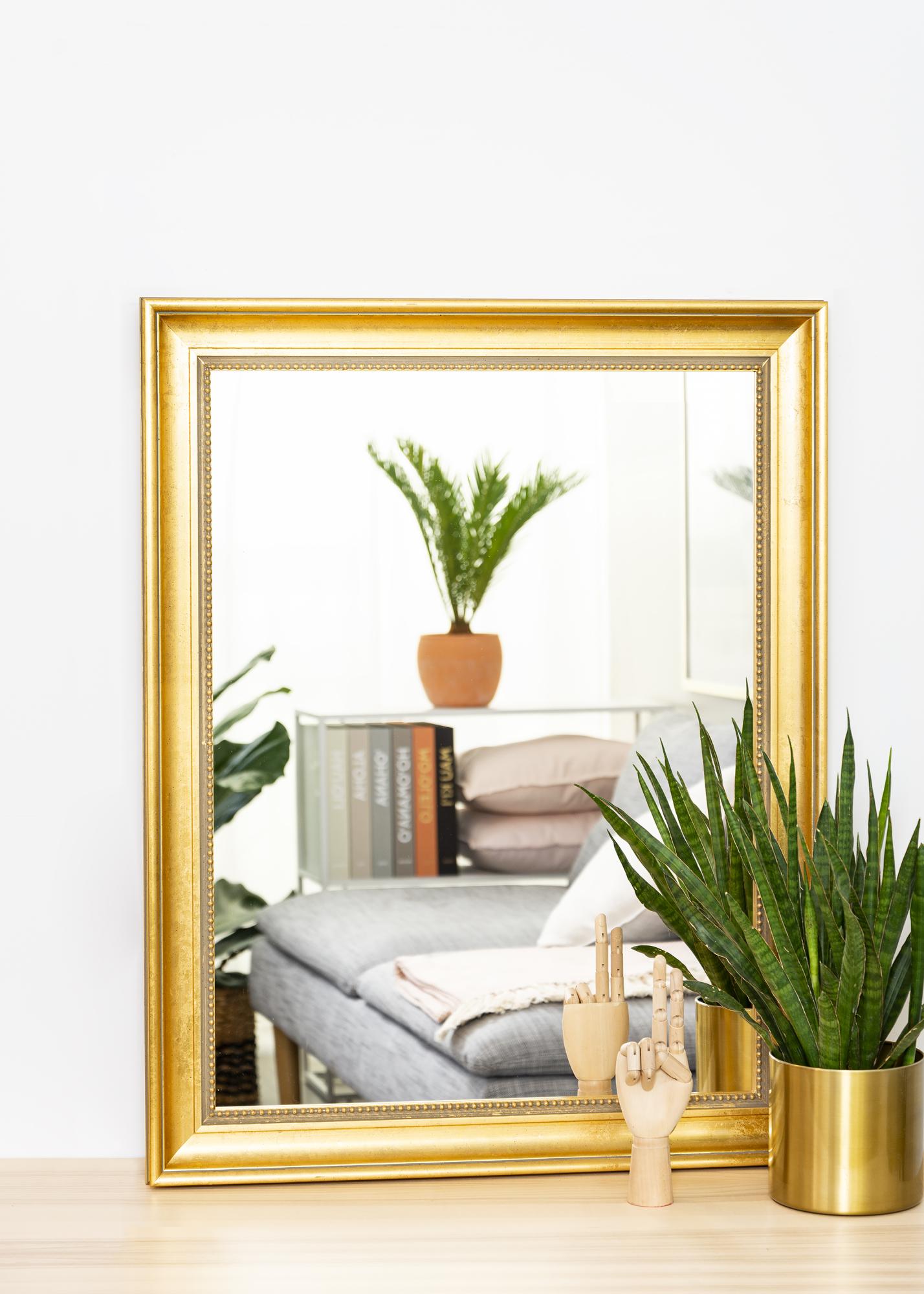 Acquire a chic mirror and make the interior of the hallway, living room, or bathroom extra luxurious. This stylish mirror is available in several different sizes so you can easily find one that suits your purpose. The mirror frame has a classic design with a wide frame and a subtle pearl pattern closest to the glass. The wood comes from sustainable forestry and is painted in a beautiful shade of gold.