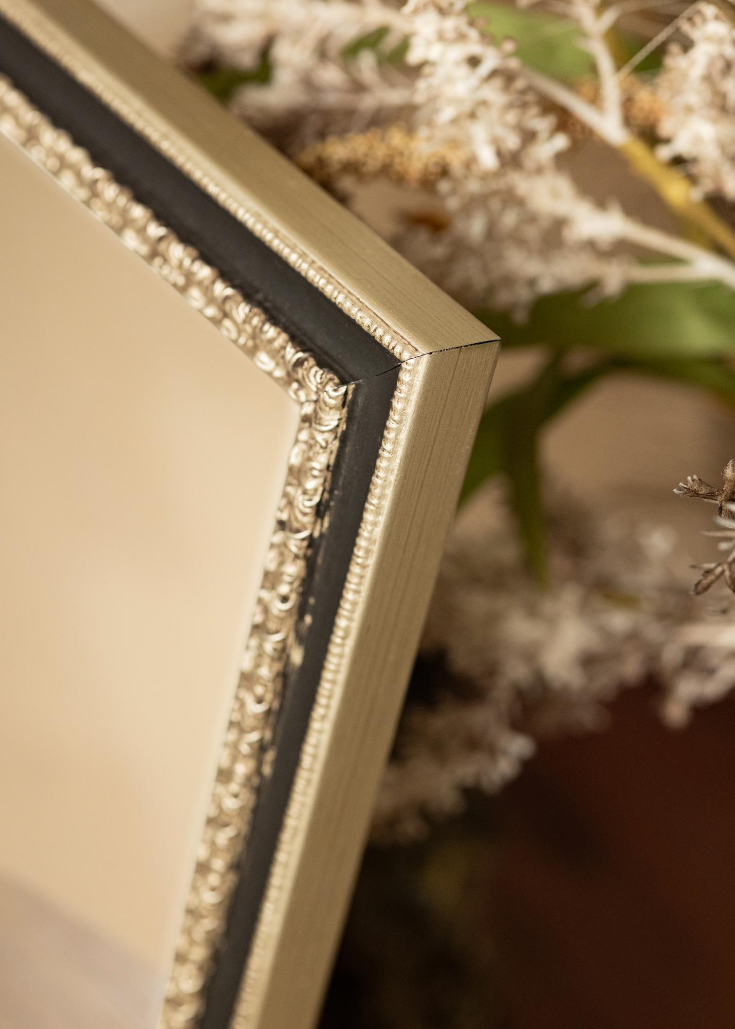 The frame is made of wood and has an antique gold finish with decorative ornaments that give the mirror a classic and timeless feel. The ornate details are further highlighted by the black edge, creating a harmonious balance between the antique and the modern.