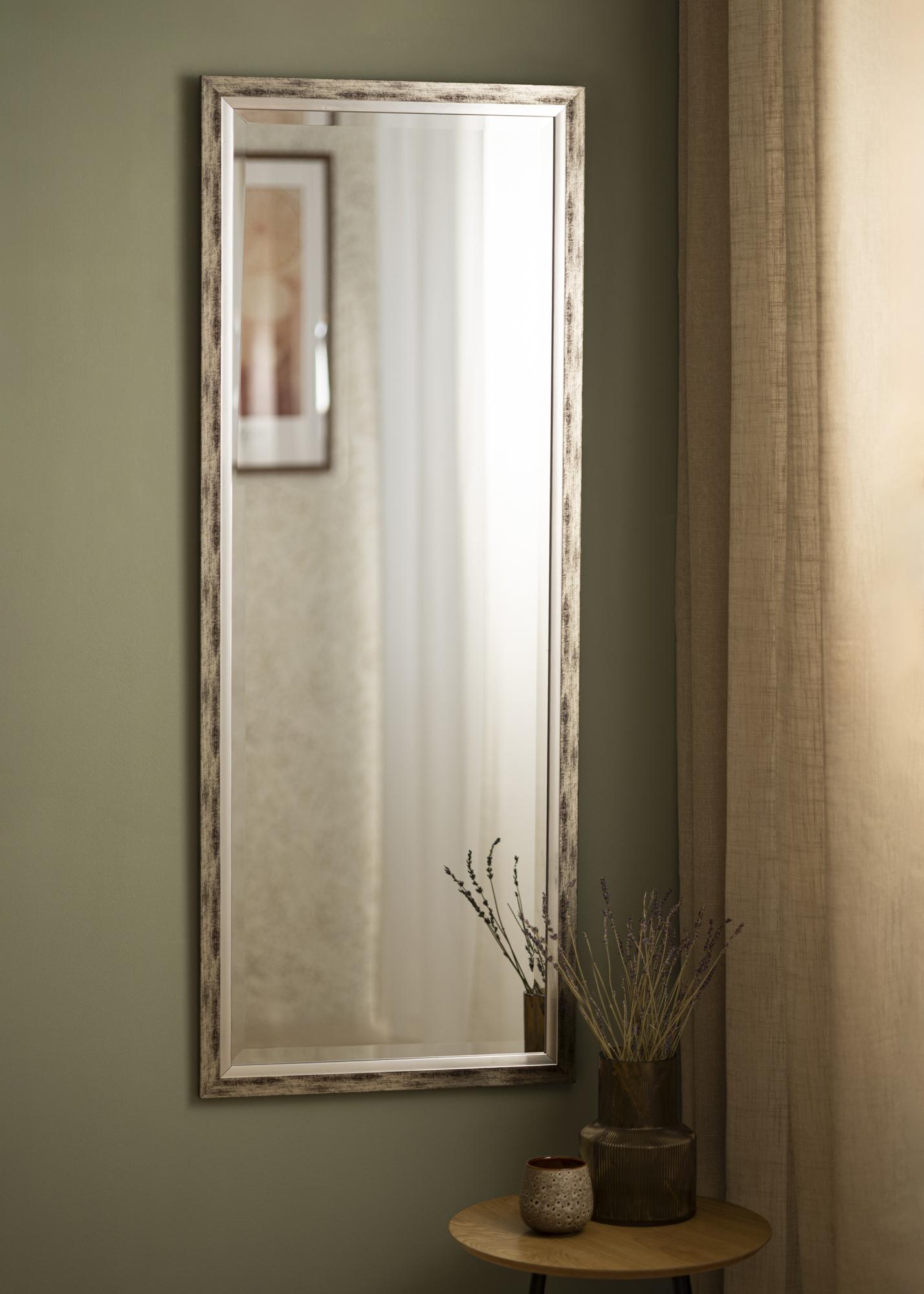 Make your walls more exciting with this beautiful mirror! The mirror has a silver frame with a wide, worn outer edge and a white edge around the glass. The glass is nicely angled, and the complete piece creates depth on your wall. The design looks just as good in a modern rural home as it does in a more urban one.