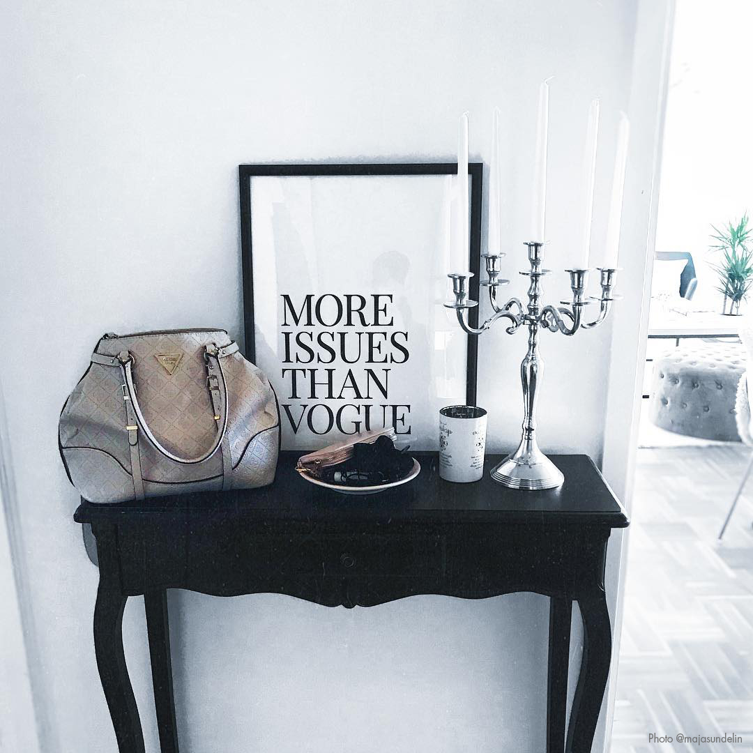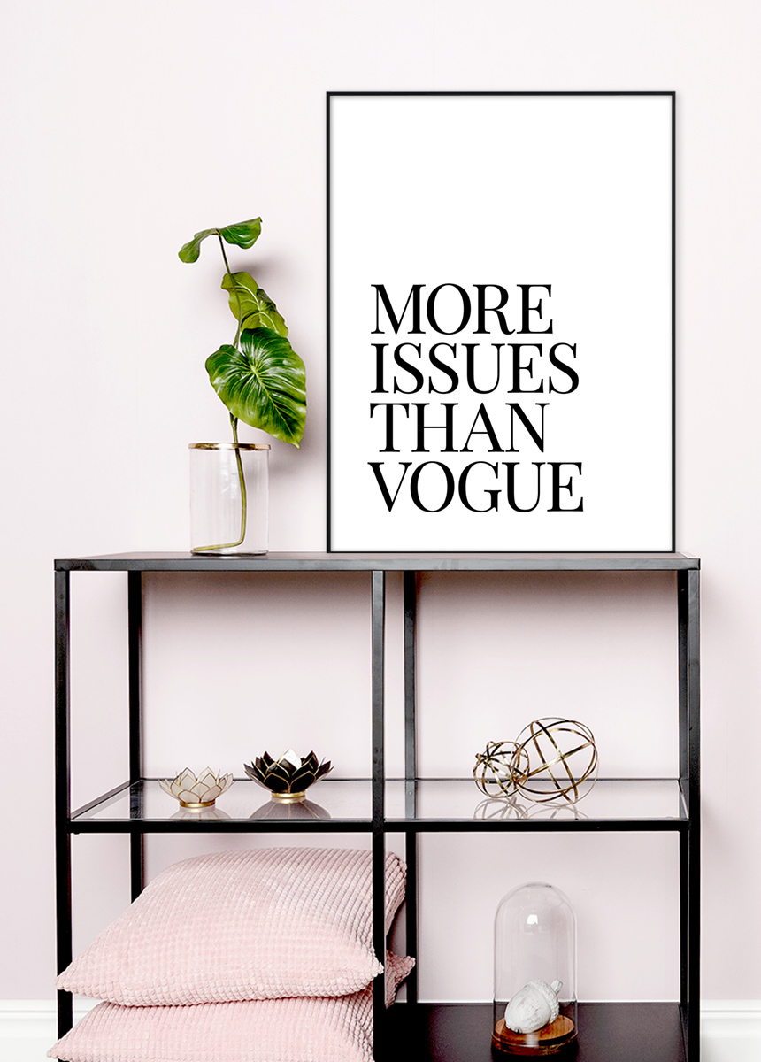 Be cheeky with a twinkle in your eye and put up this stylish poster in your home or workplace. The poster is white with black text that reads "More Issues Than Vogue". As an extra witty detail, the text is written in a font reminiscent of the one used in the famous fashion magazine's logo. Complement with a gold-coloured frame for an extra glamorous feel! Available in several different sizes, one of which is guaranteed to fit just the room where you want it.