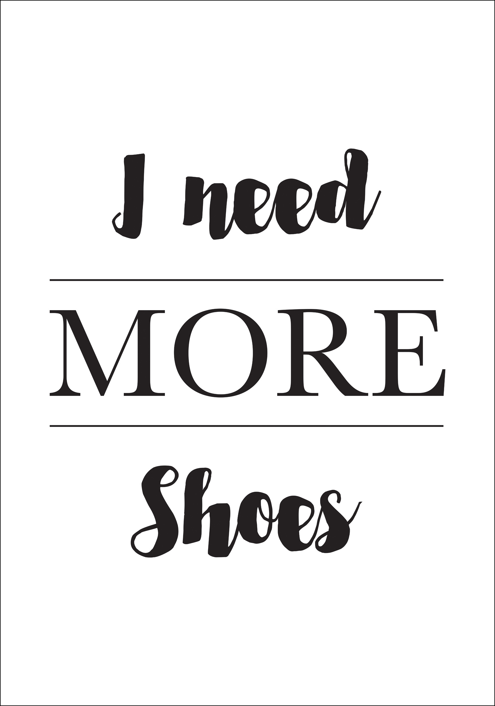 If you are a proud shopaholic focused on shoes, we have a poster that suits you perfectly! The charming design is black and consists of the text "I need more shoes" printed in 2 different fonts. In the middle, there are two decorative black lines. The sleek and minimalist design fits perfectly with a black or white frame. If you want to make it even more personal, choose a frame in your favourite colour. The poster is available in several different sizes so you can easily find one that fits your desk or wall.