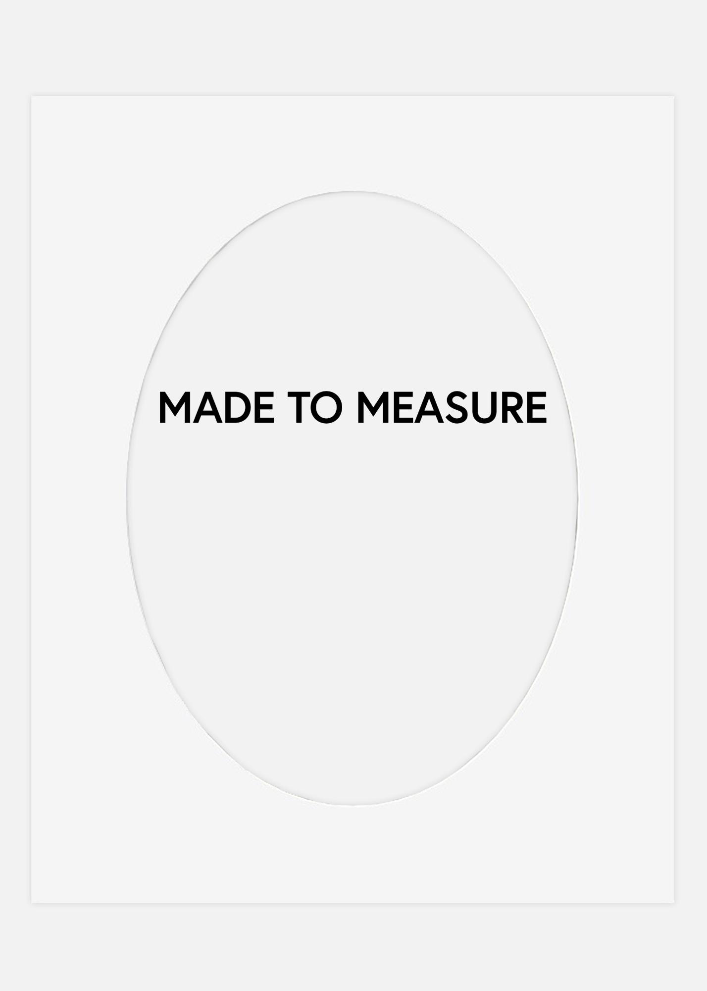 White oval or round mount in custom-made dimensions with white 45 degree bevelled edge, next to the image. A good choice for portraits in classic style.