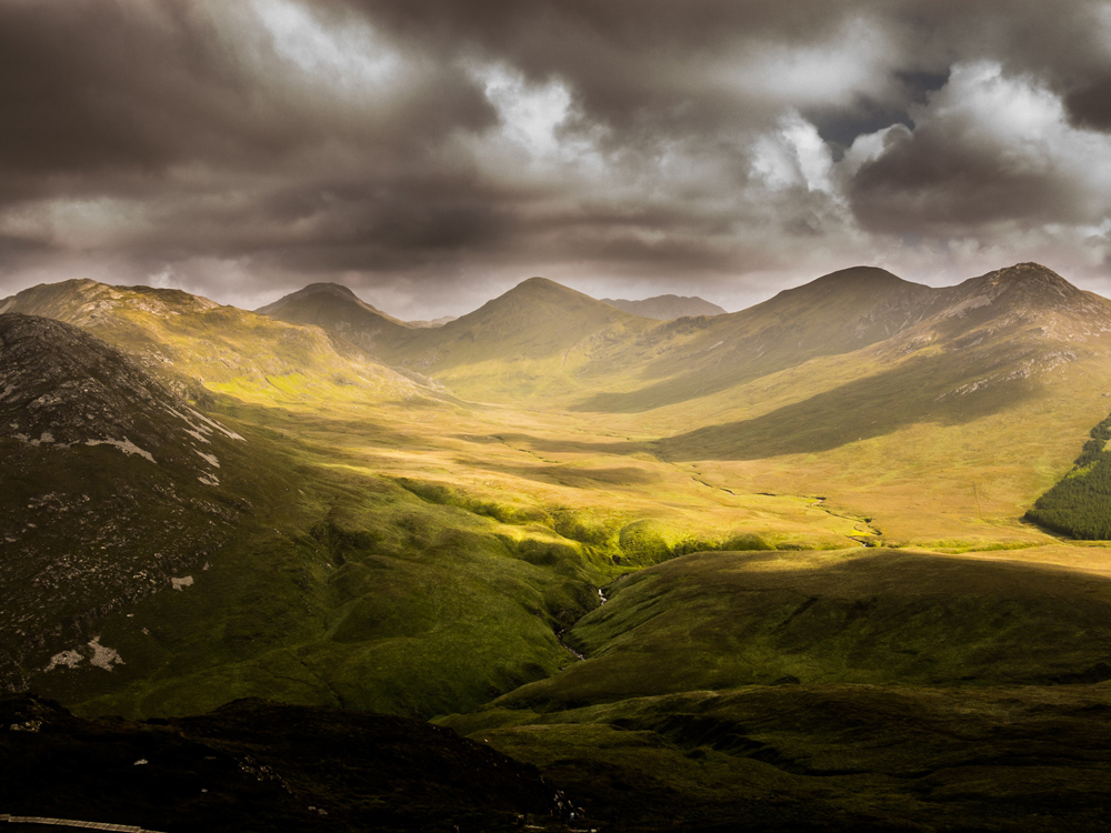 Dramatic landscape portrait with storm clouds looming over a mountain range while the sun lights up the valley below. Soft muted colours underline the drama in the picture and make the photograph really stand out. Best suited in a frame that highlights the depth of the picture and does not steal attention from the subject.