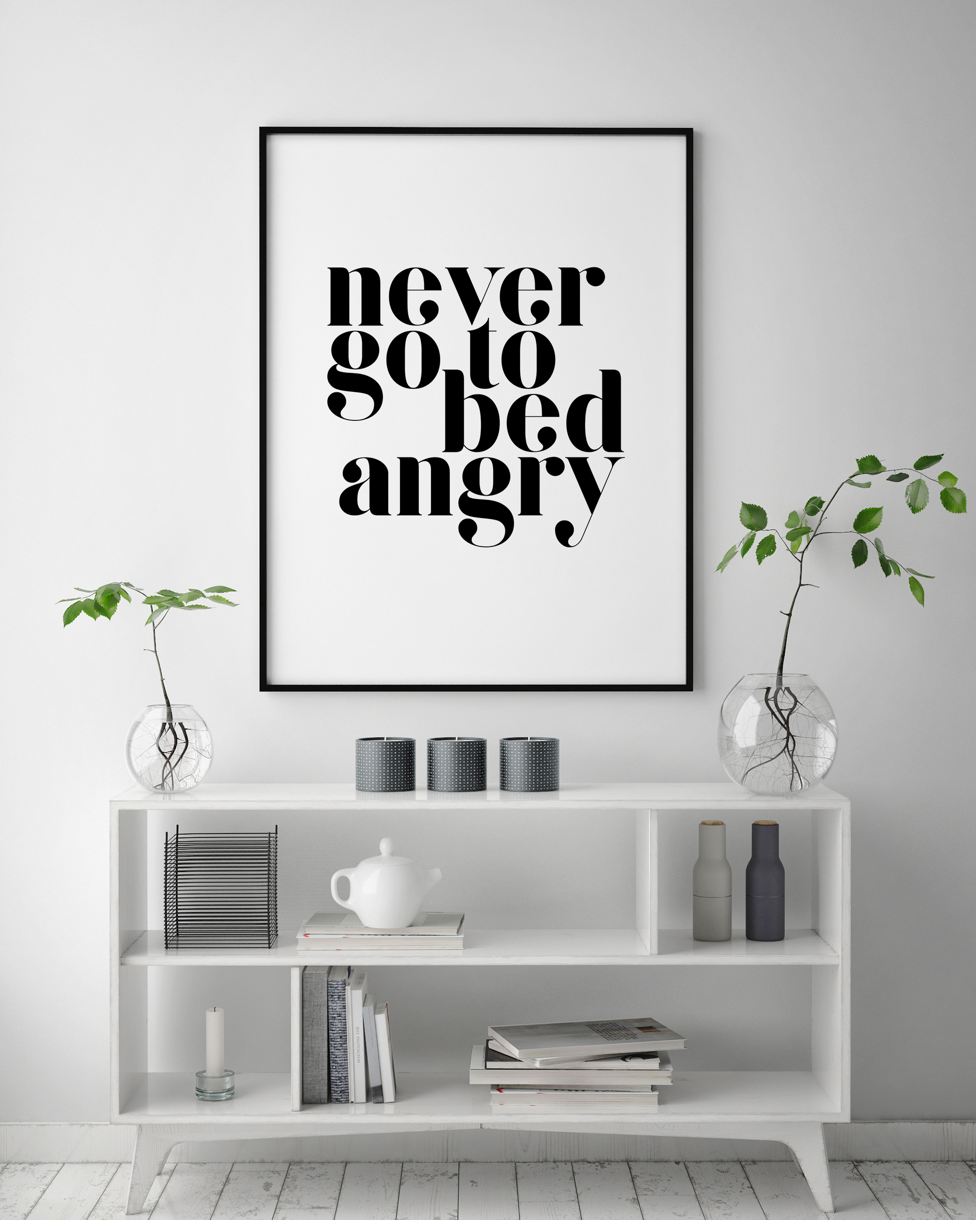 A poster of the famous phrase, "never go to bed angry" printed with lower case letters and bolded. The writing is with black ink on a white surface. On your bedroom wall, this poster always reminds you to be at peace before sleeping. A perfect print to make sleeping healthy and enjoyable.
