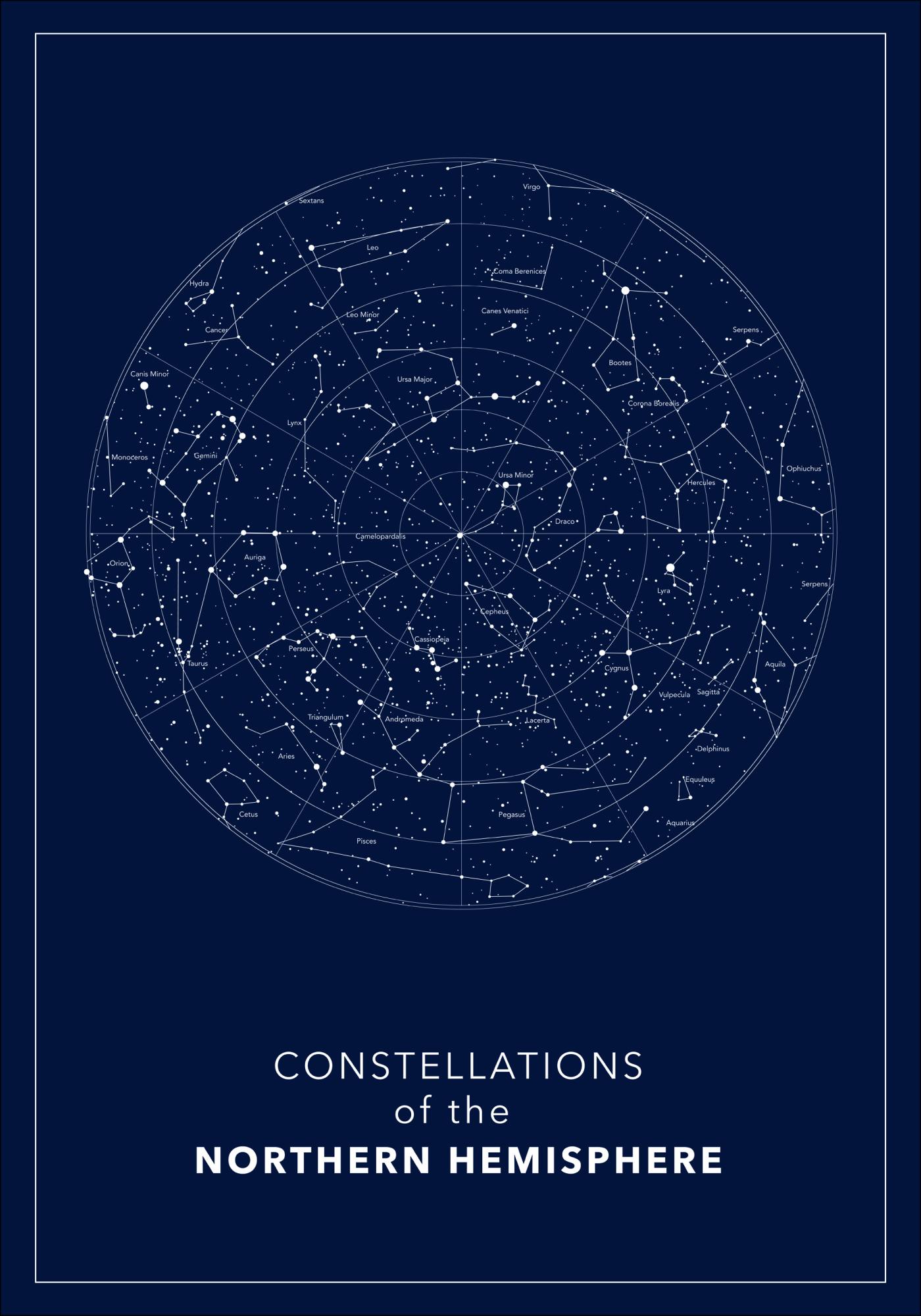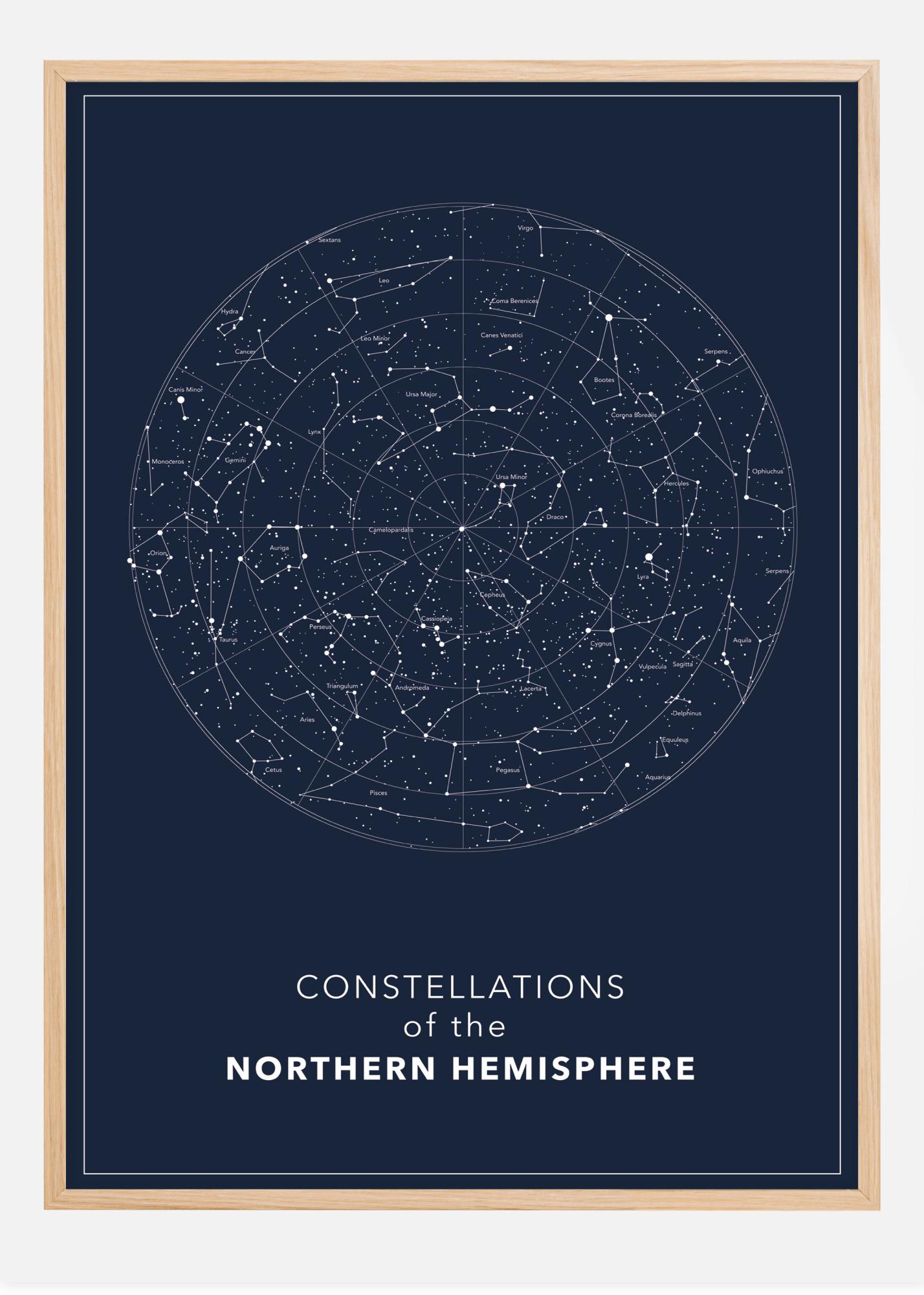 A glittering poster of a white circle with Northern Hemisphere constellations. The constellations are highlighted with a faint white line with the name written under each one. Set on a dark blue background, this is a very clear explanation of the Northern Hemisphere. An ideal print to hang in a studio.