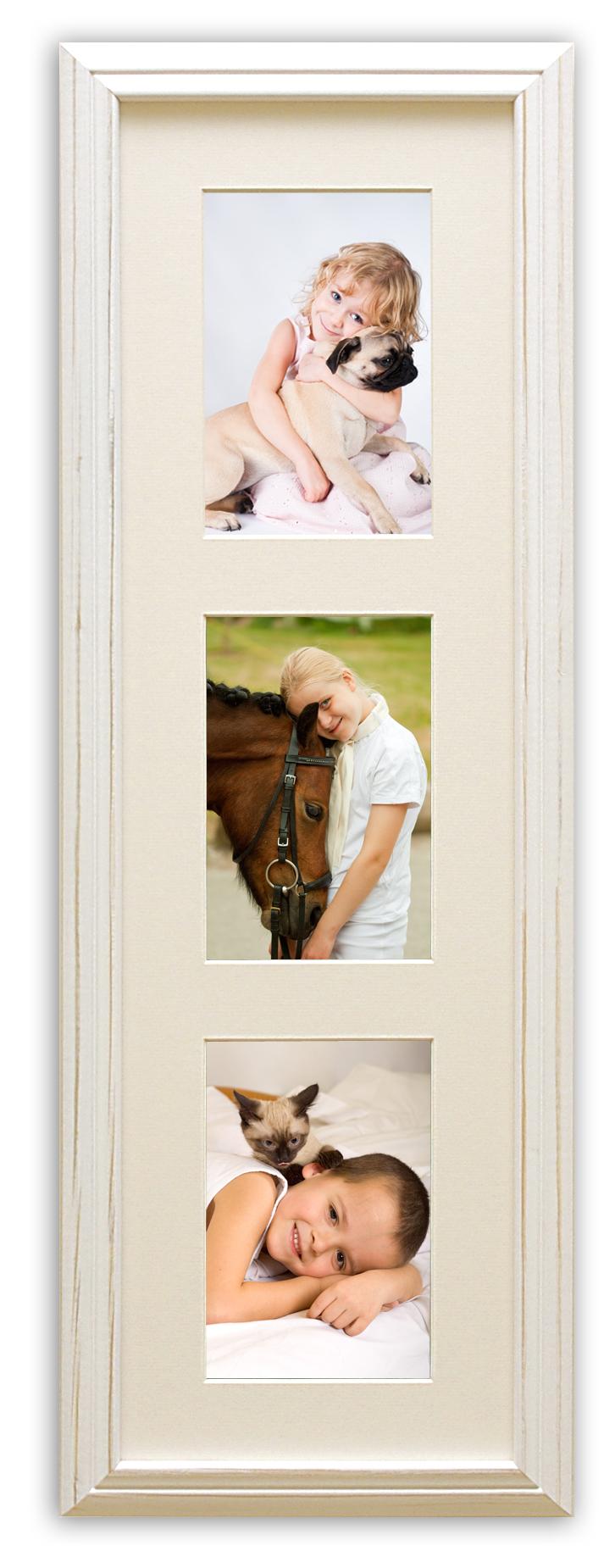 Collage picture frame that has space for 3 pictures, with a vintage-inspired wooden frame and a white base tone that has worn areas, revealing the wooden surface of the picture frame. This gives the picture frame its special character.